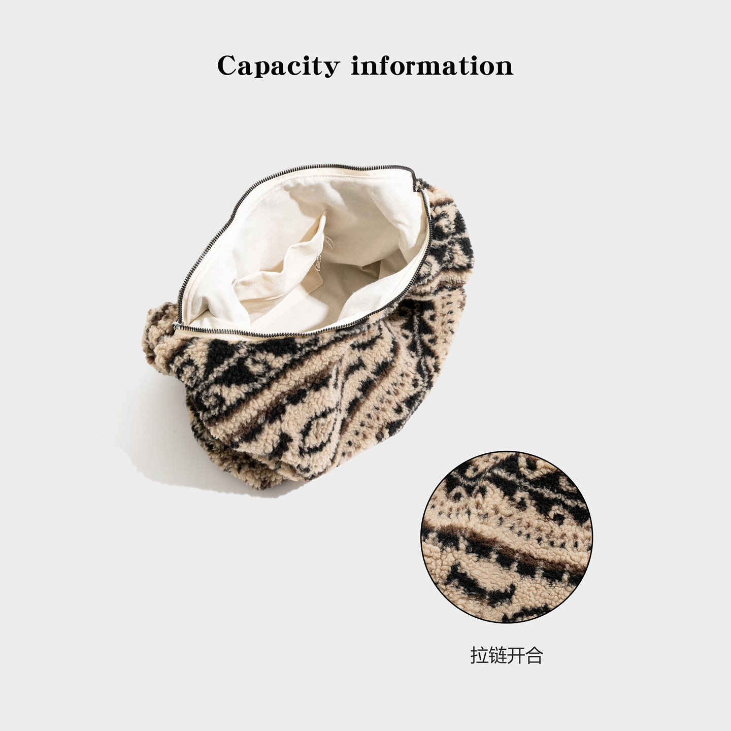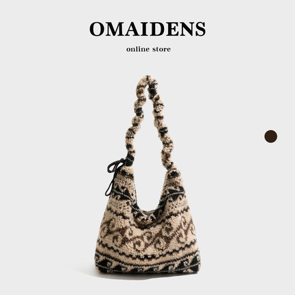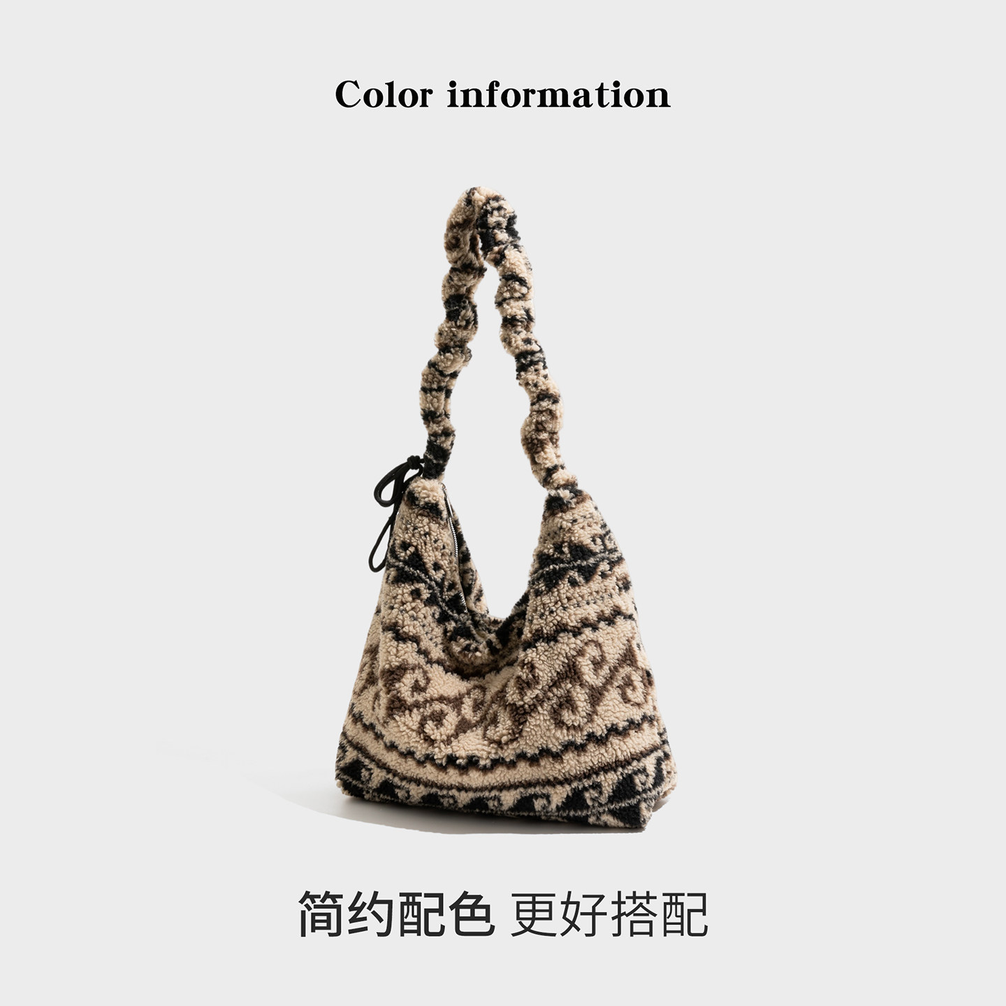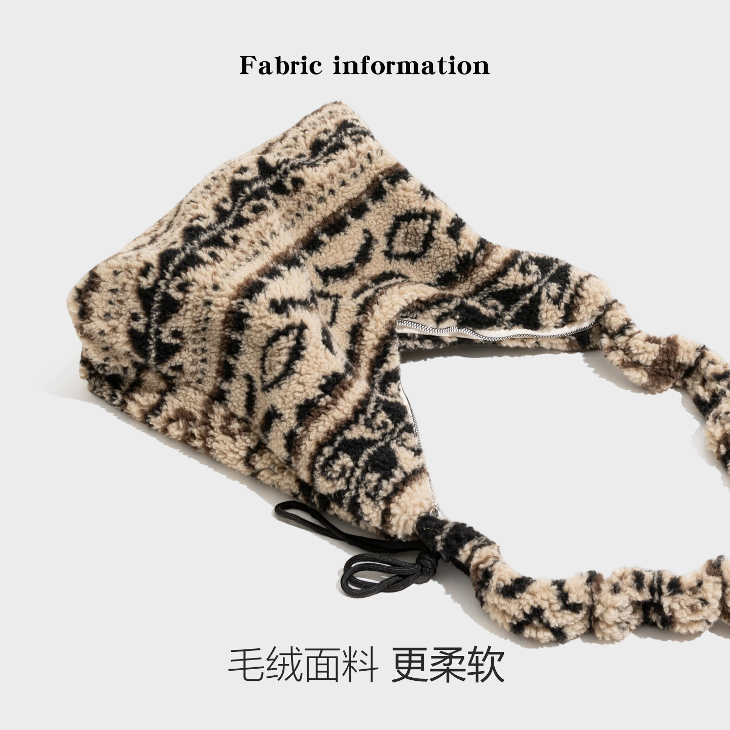 橙子少女复古羊羔毛费尔岛托特包女大容量民族风毛绒绒单肩斜挎包