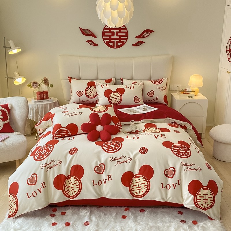 简约婚庆四件套纯棉红色被套床单婚房喜被全棉新婚庆结婚床上用品