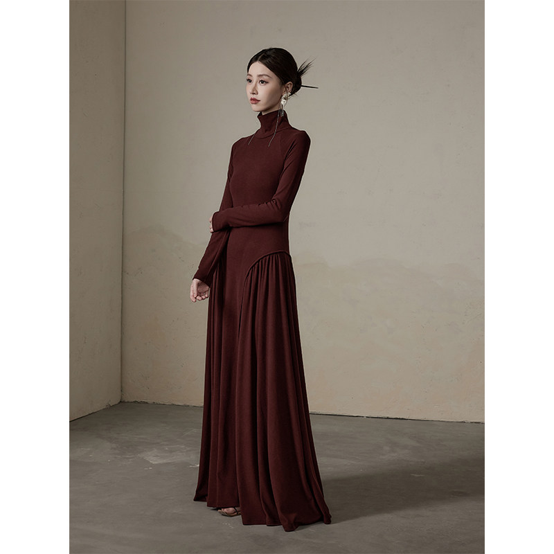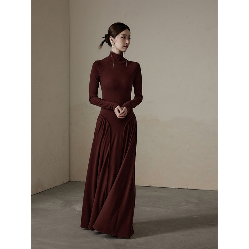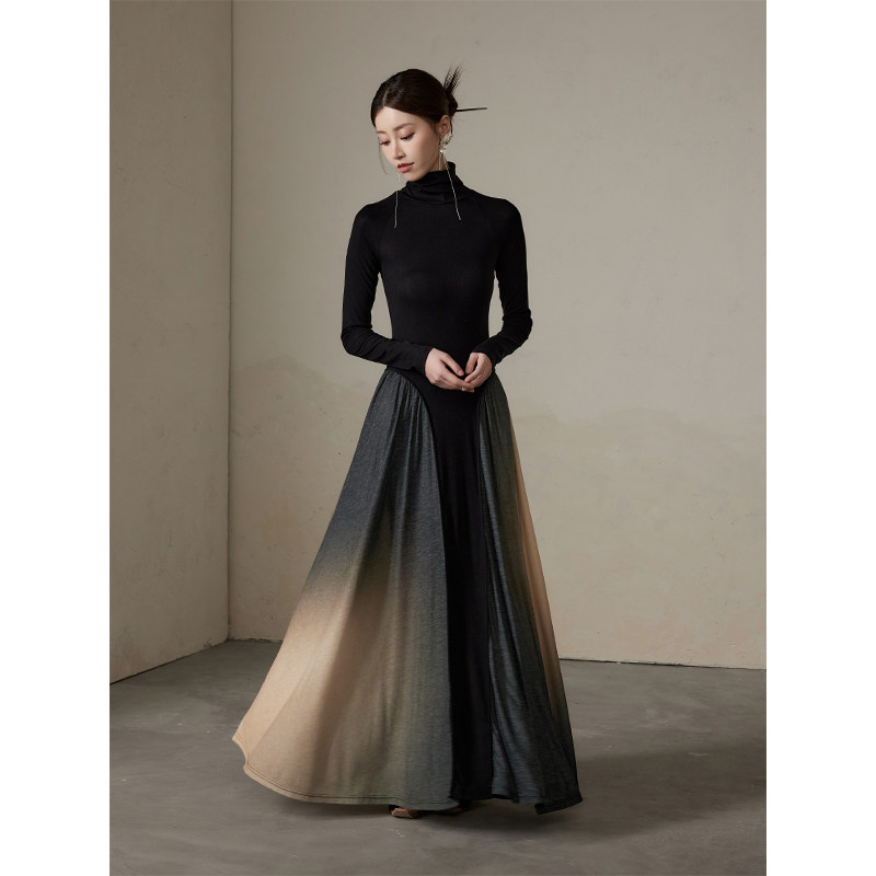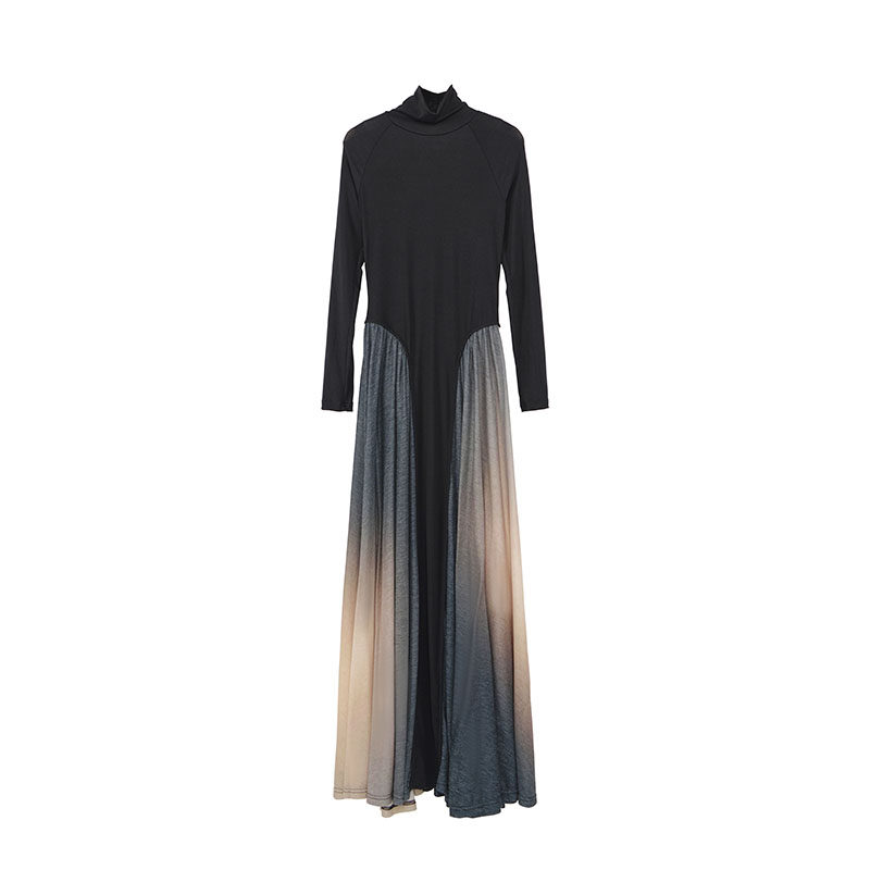 ONMOON 秋冬高领渐变长袖针织连衣裙 2024新款拼接内搭打底裙子女