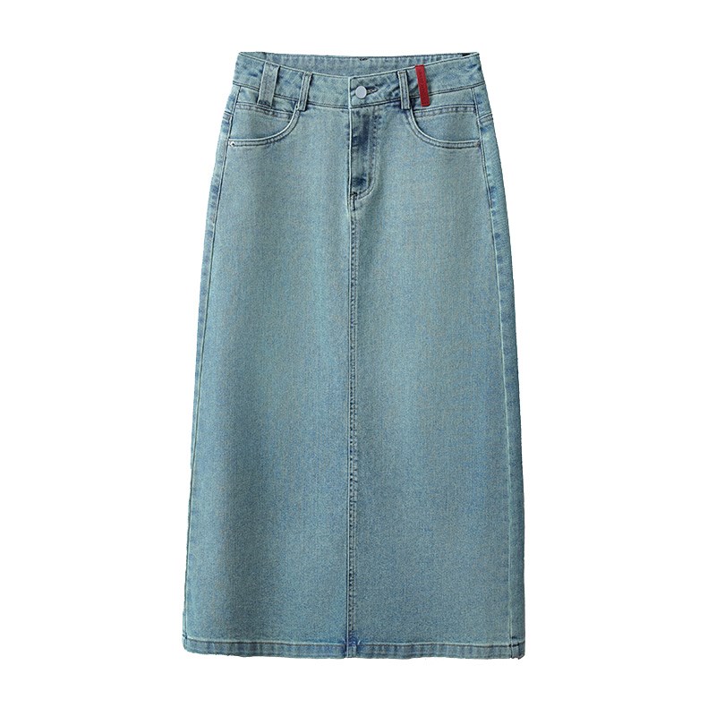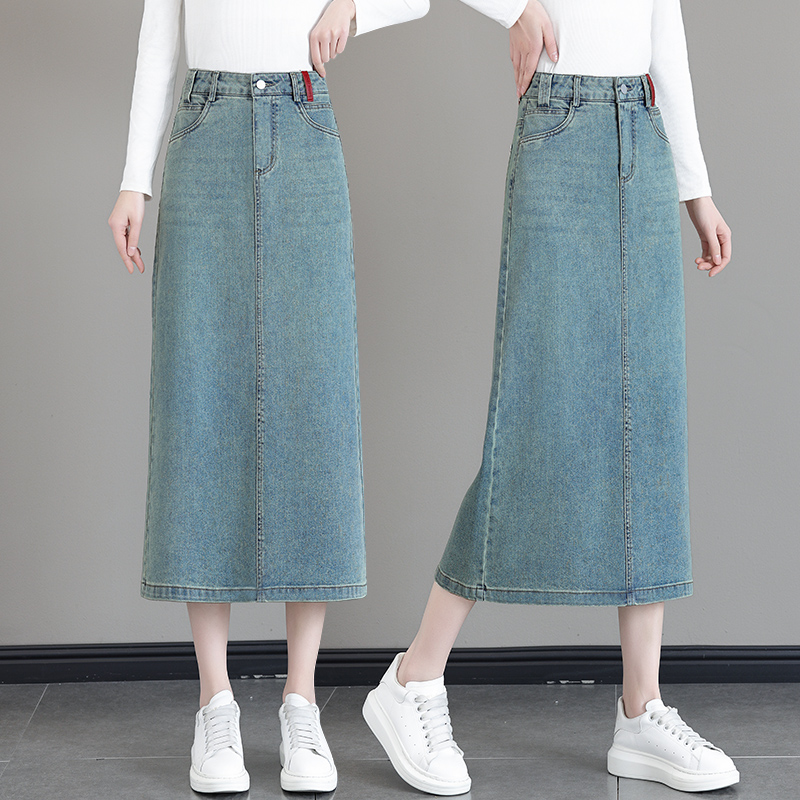 复古蓝牛仔半身裙女新款2024春季高腰数字刺绣开叉一步A字中长裙