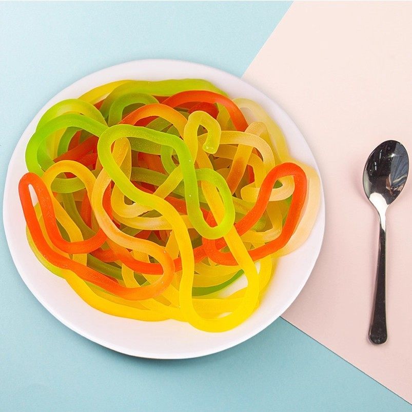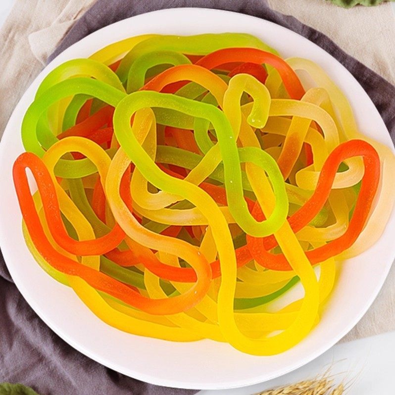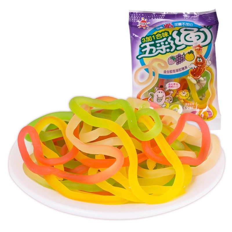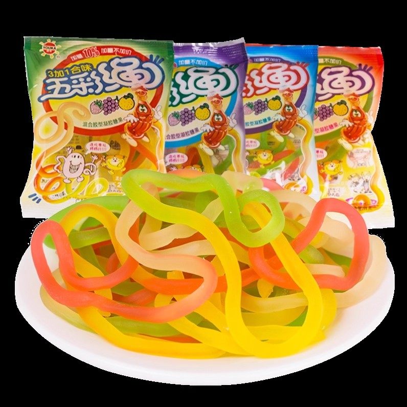 优卡五彩绳橡皮糖果汁味彩虹长条软糖儿童年怀旧小零食请避光储存