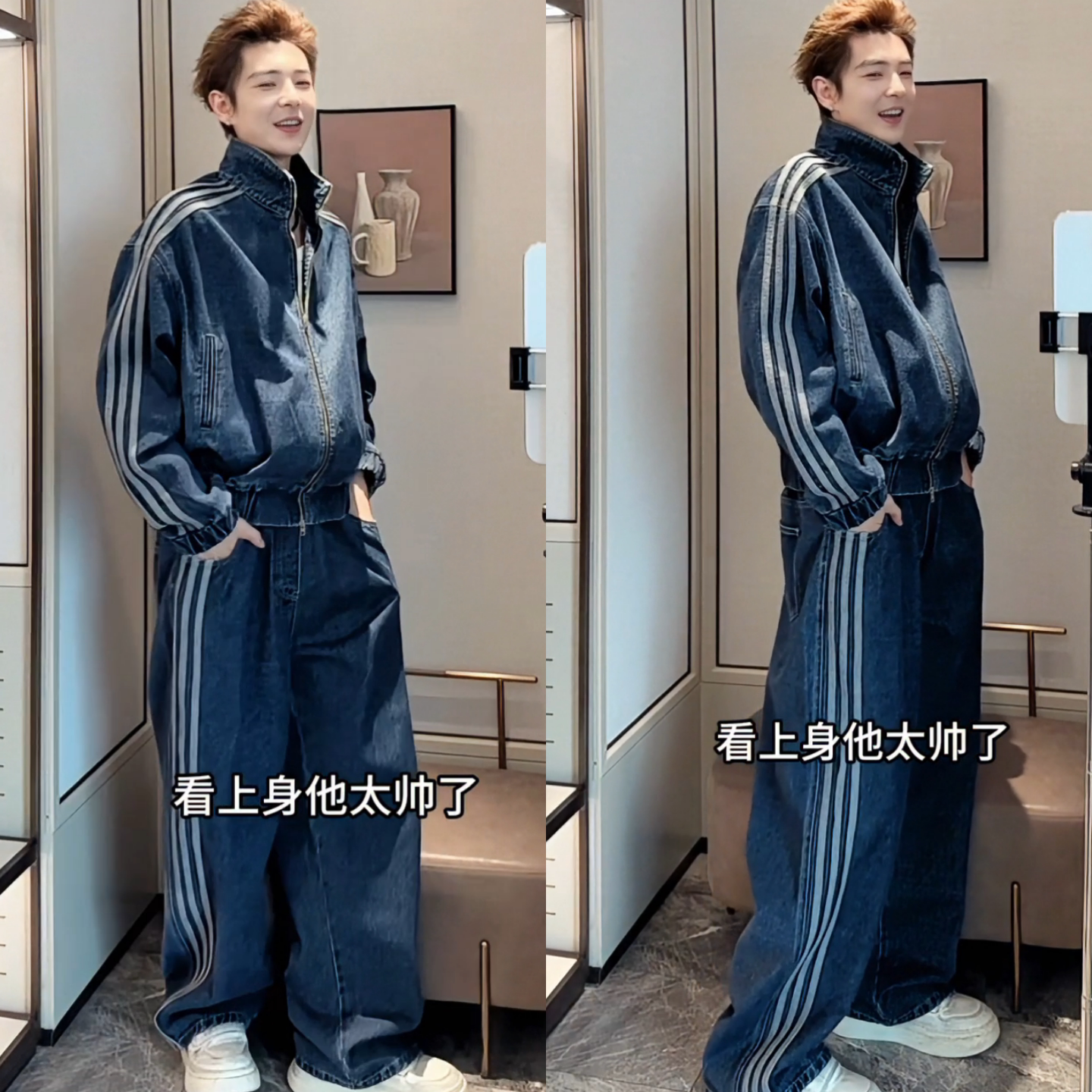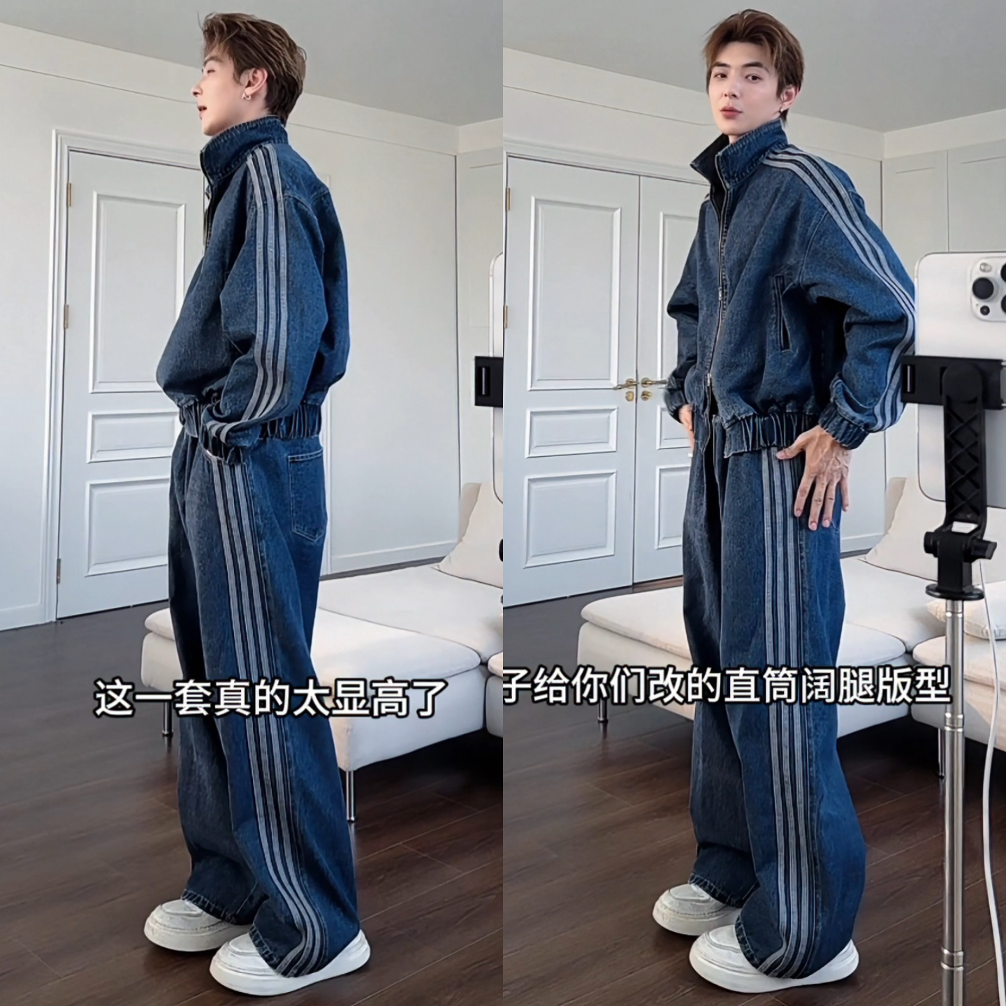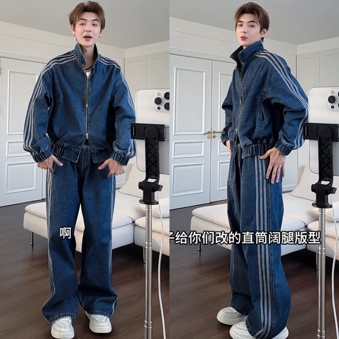 冬季新款美式复古男士休闲重磅三条杠拼接立领夹克休闲裤牛仔套装