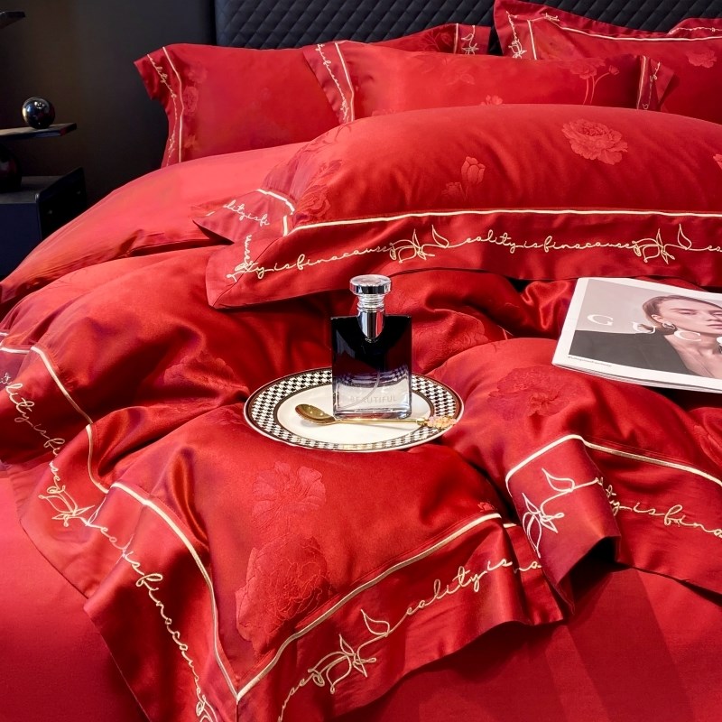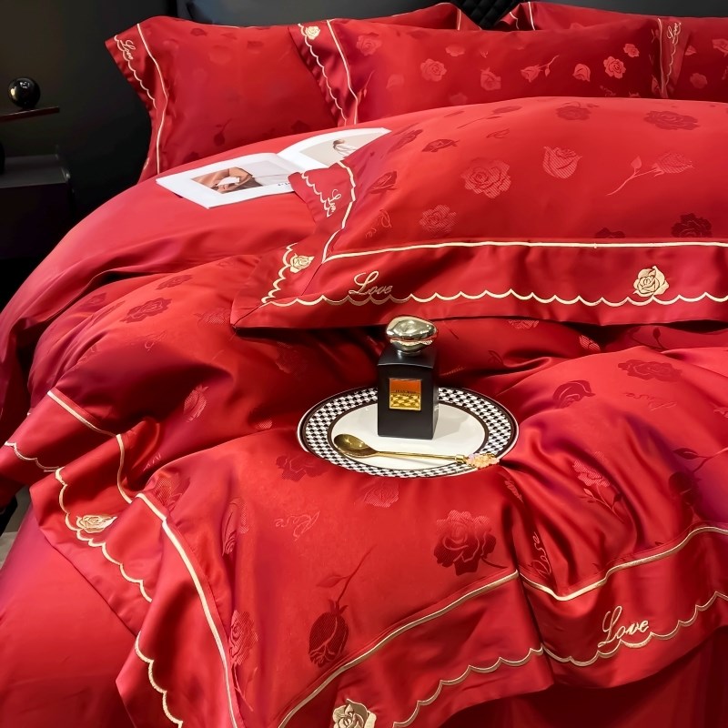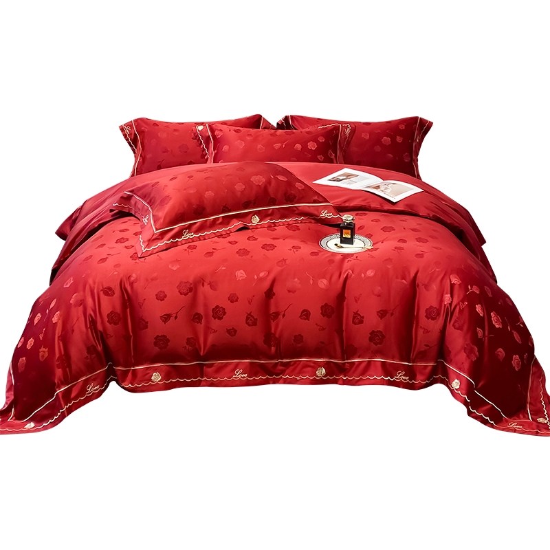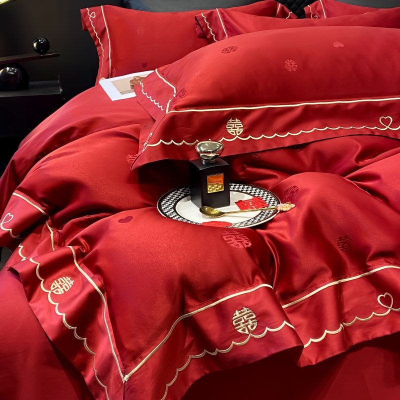 高级感大喜结婚庆全棉四件套贡缎提花刺绣被套大红色陪嫁床上用品