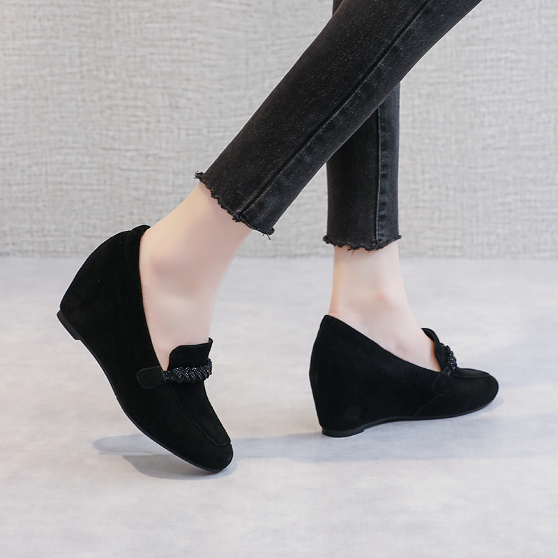 坡跟单鞋女一脚蹬真皮内增高女鞋