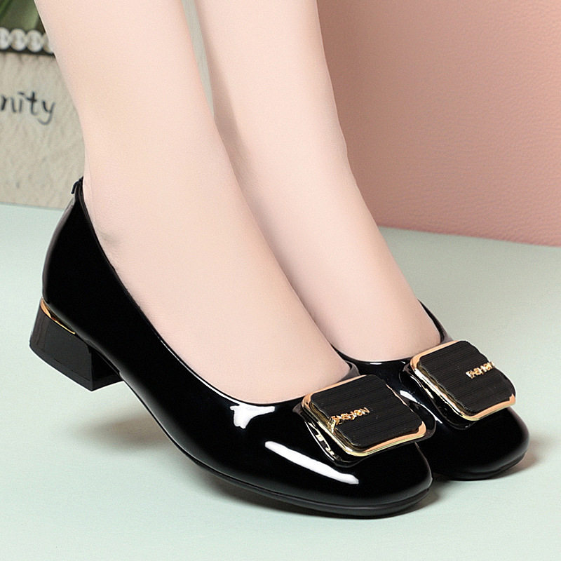 春秋真皮漆皮单鞋女浅口粗跟婚礼妈妈鞋亮皮低跟皮鞋方头新款女鞋