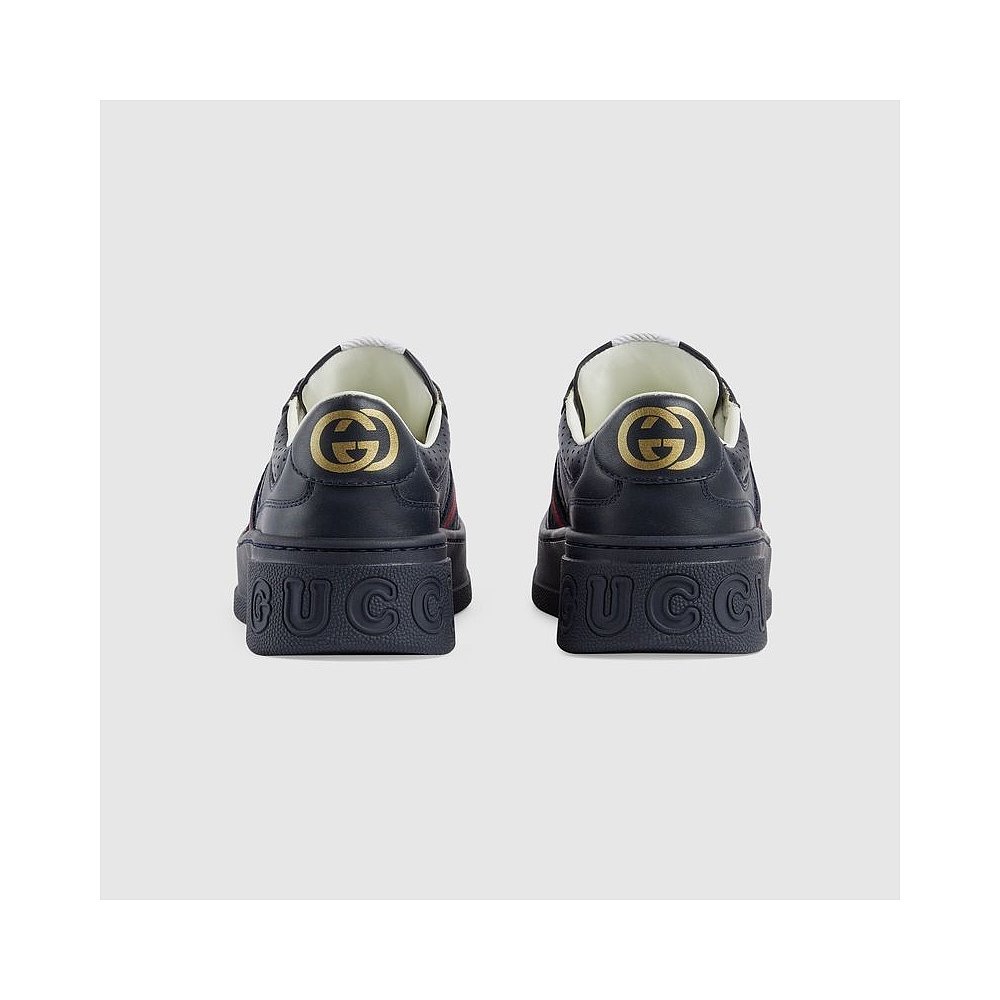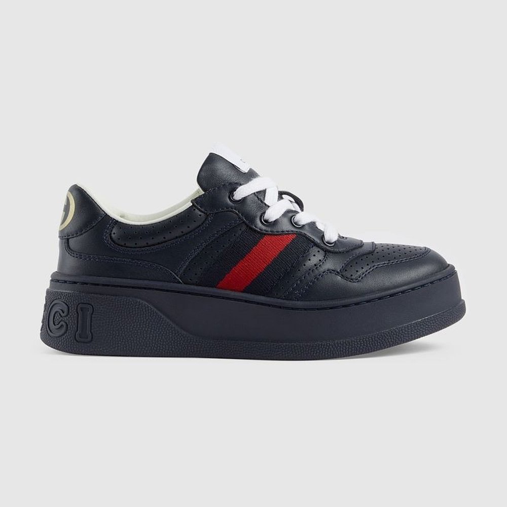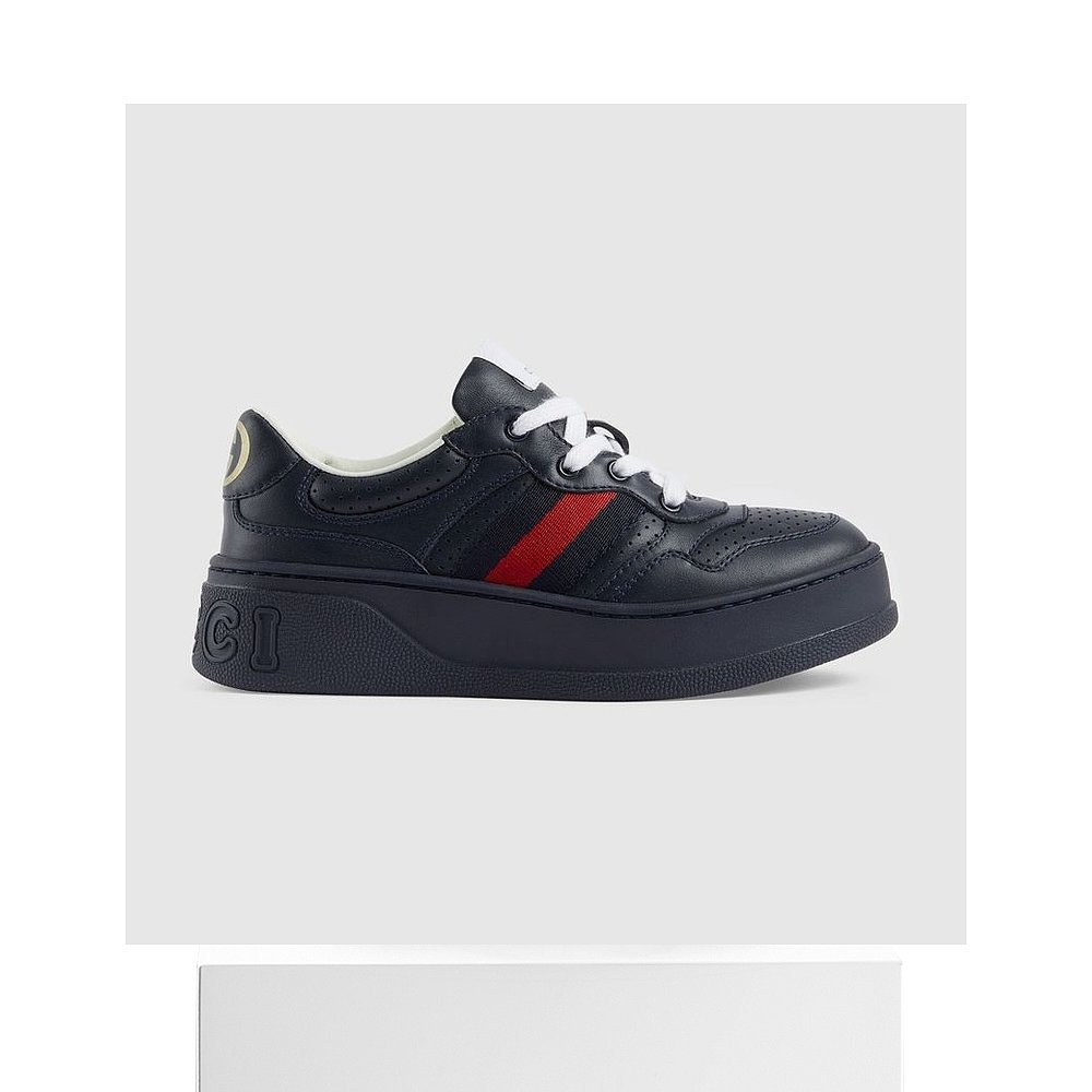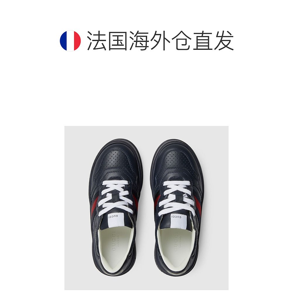 自营欧洲直邮Gucci古驰女孩深蓝色皮革织带条纹儿童运动鞋新款