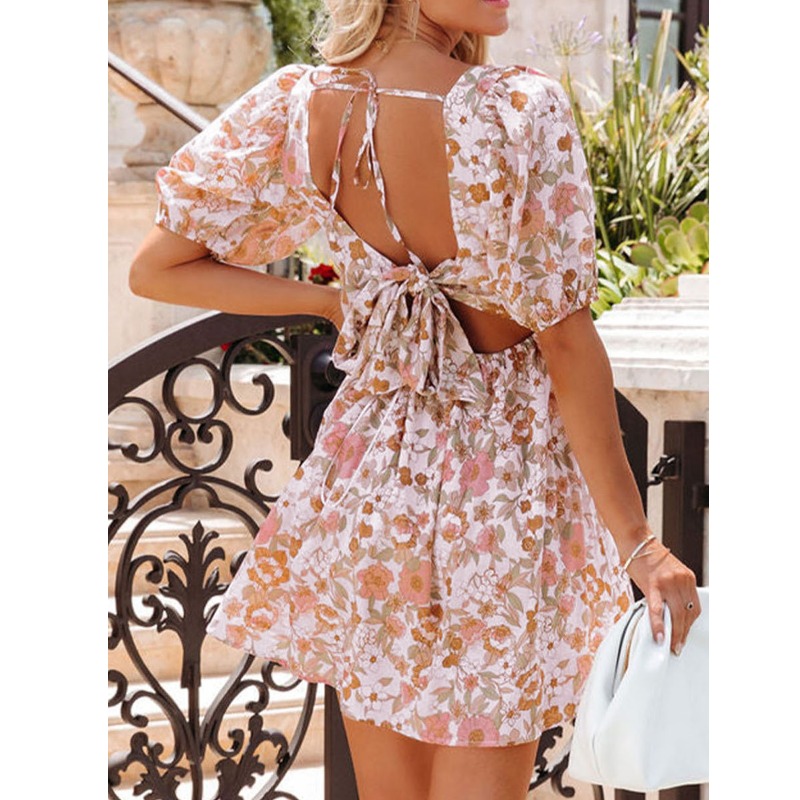 欧洲站夏季小个子甜美碎花印花方领高腰露背性感短袖连衣裙DRESS