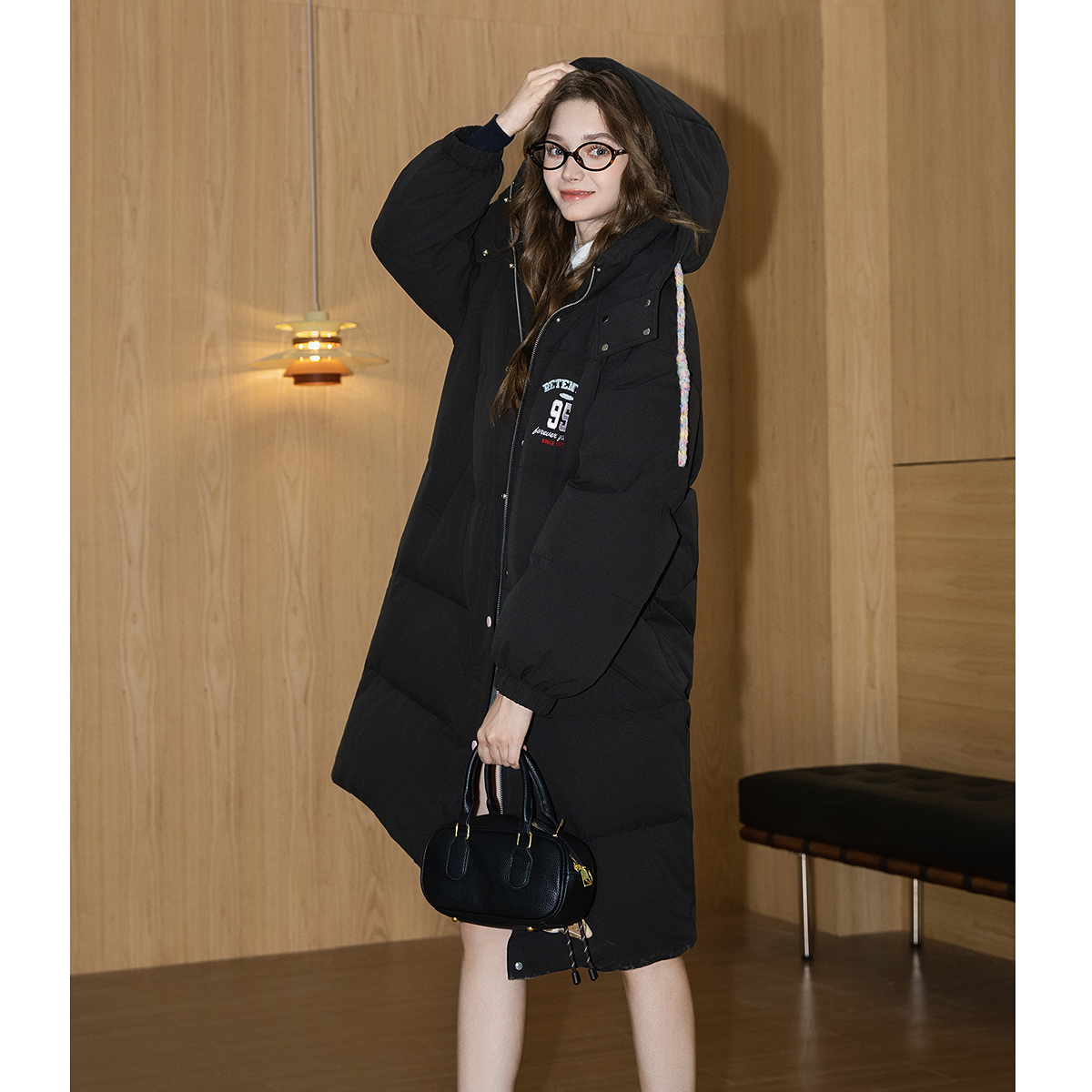 唐狮2025冬季加厚羽绒服女连帽长款过膝保暖羽绒外套美式学院风