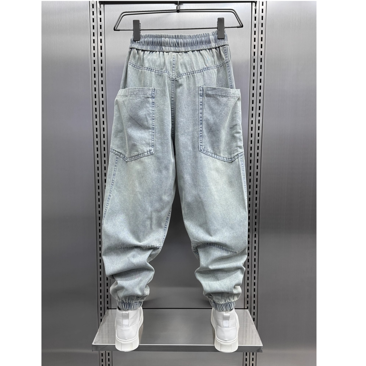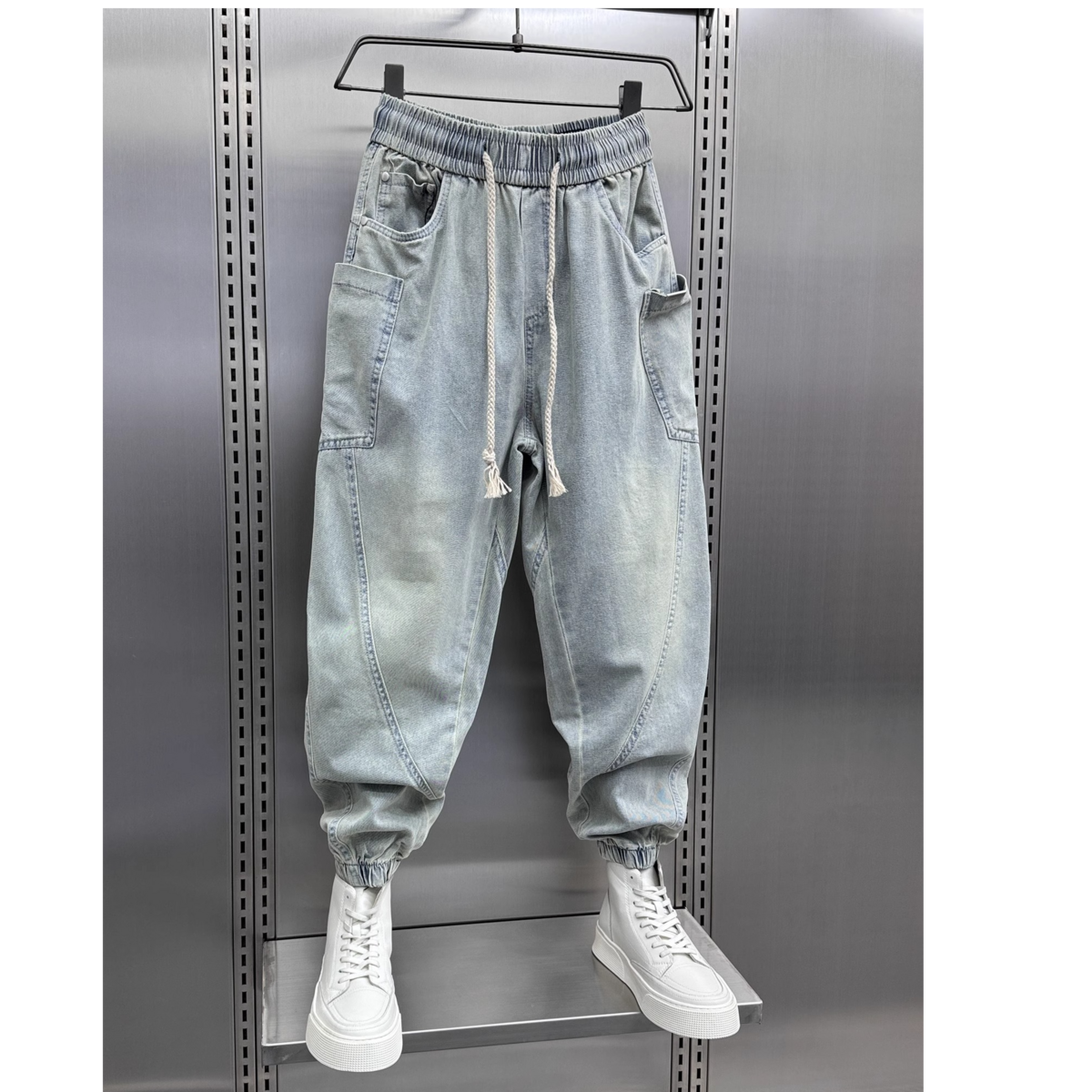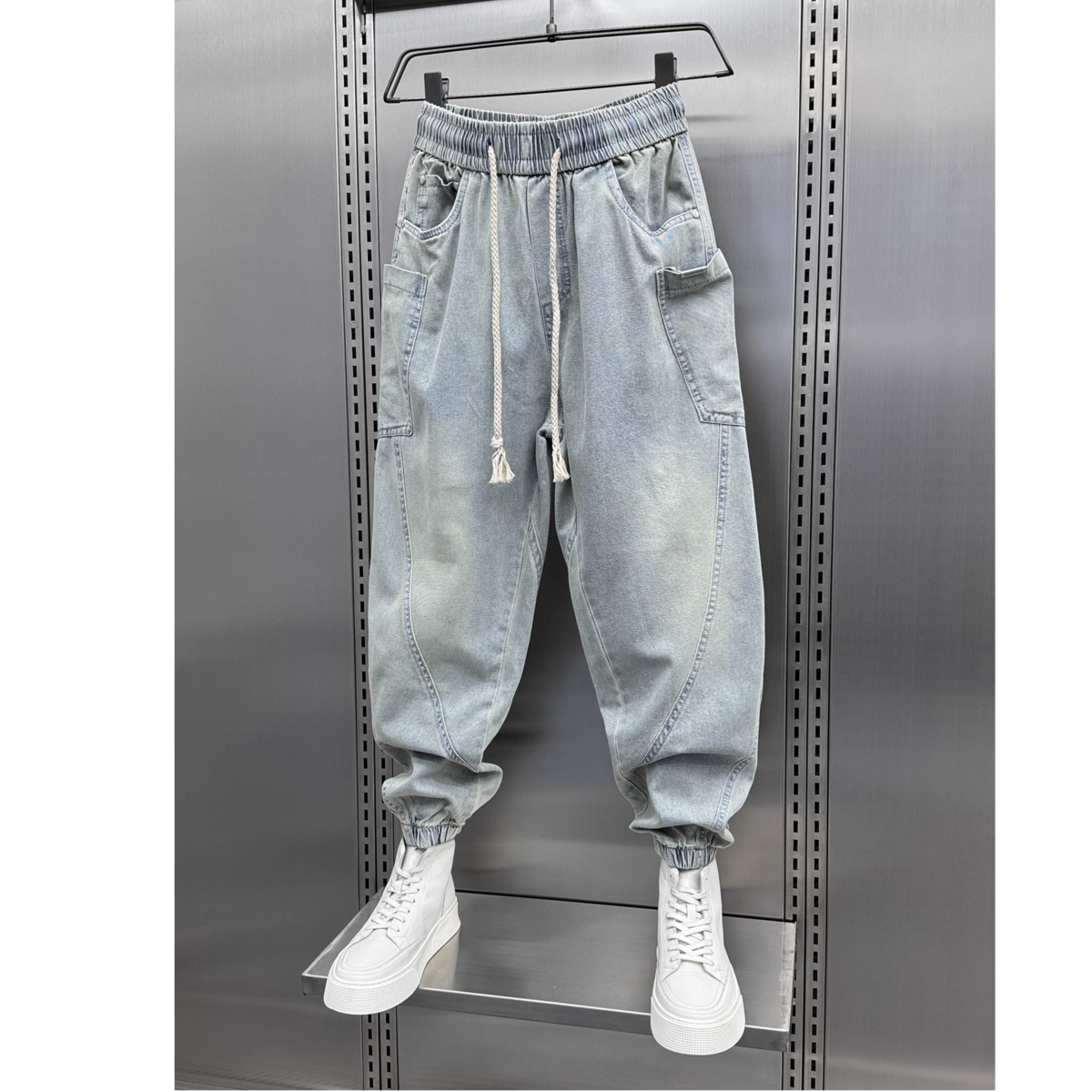 拼接秋季新款牛仔裤男痞帅休闲水洗蓝色哈伦裤宽松潮流束脚九分裤