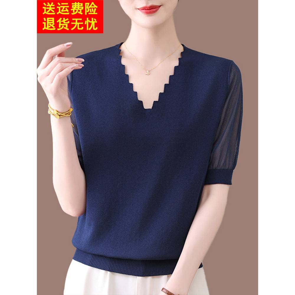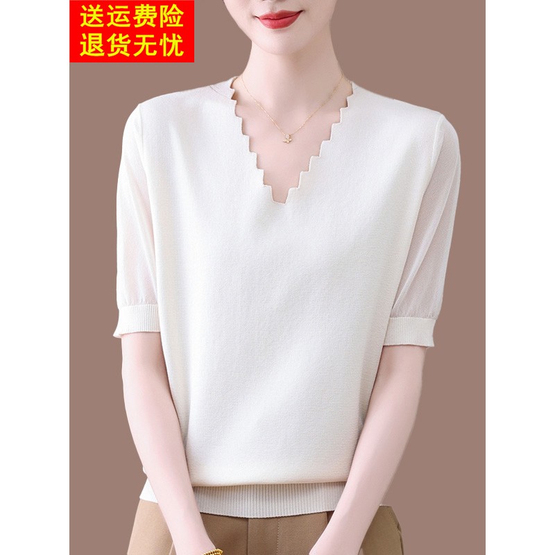 中年妈妈桑蚕丝v领短袖t恤女2025新款夏装洋气蕾丝纱袖冰丝小衫薄