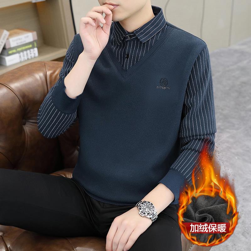 男士加绒假两件毛衣2025新款衬衫领针织衫潮内穿衣服1010r
