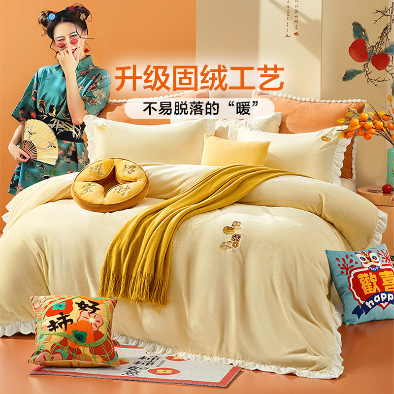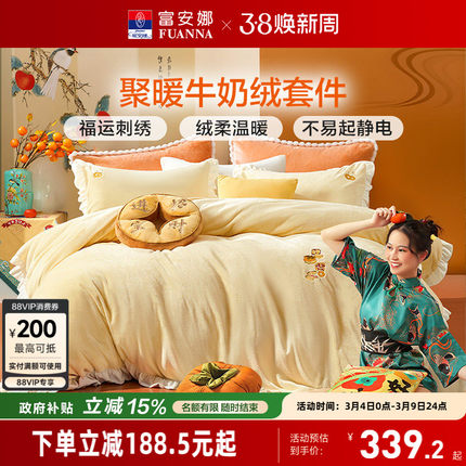 富安娜牛奶绒四件套冬季加厚珊瑚绒法兰绒被套床单床上用品三件套