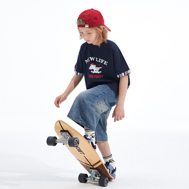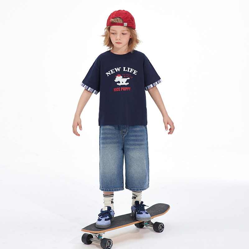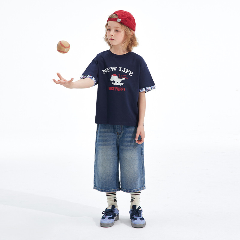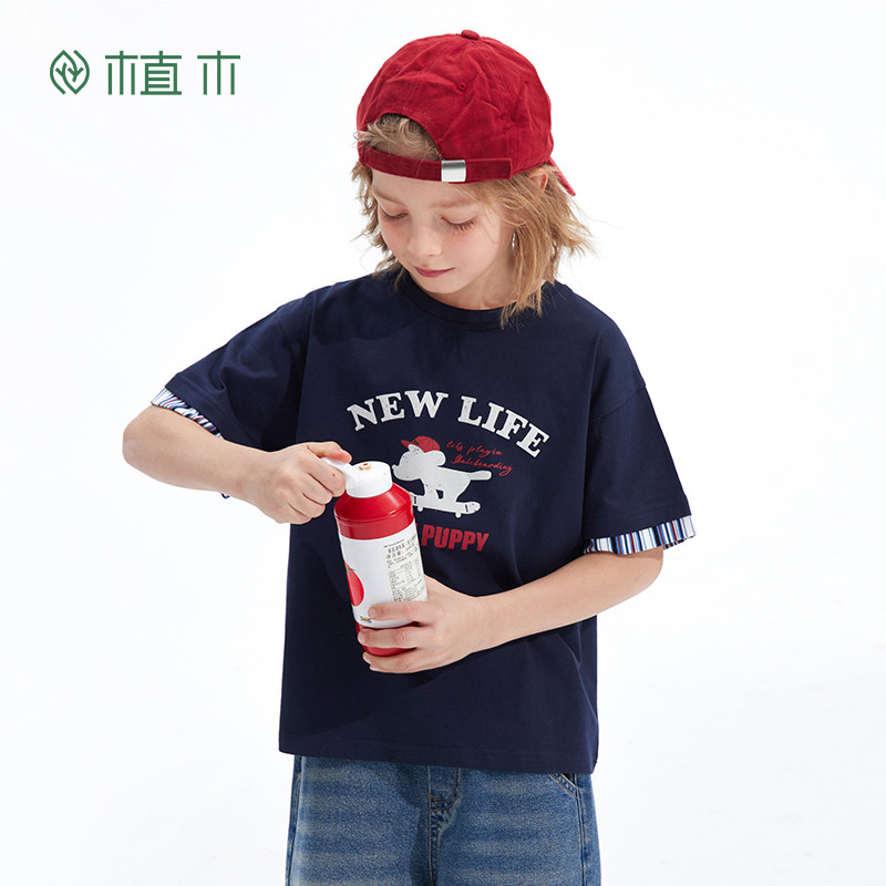 植木童装男童T恤2025夏季新款中大童假两件短袖棉质上衣儿童T恤