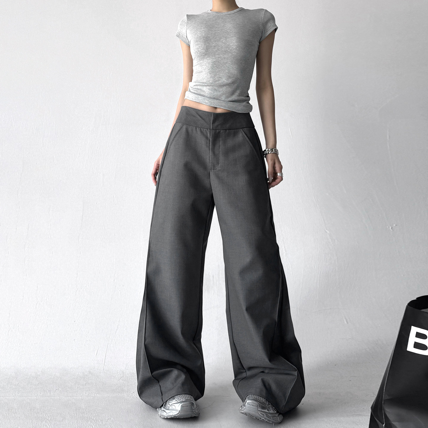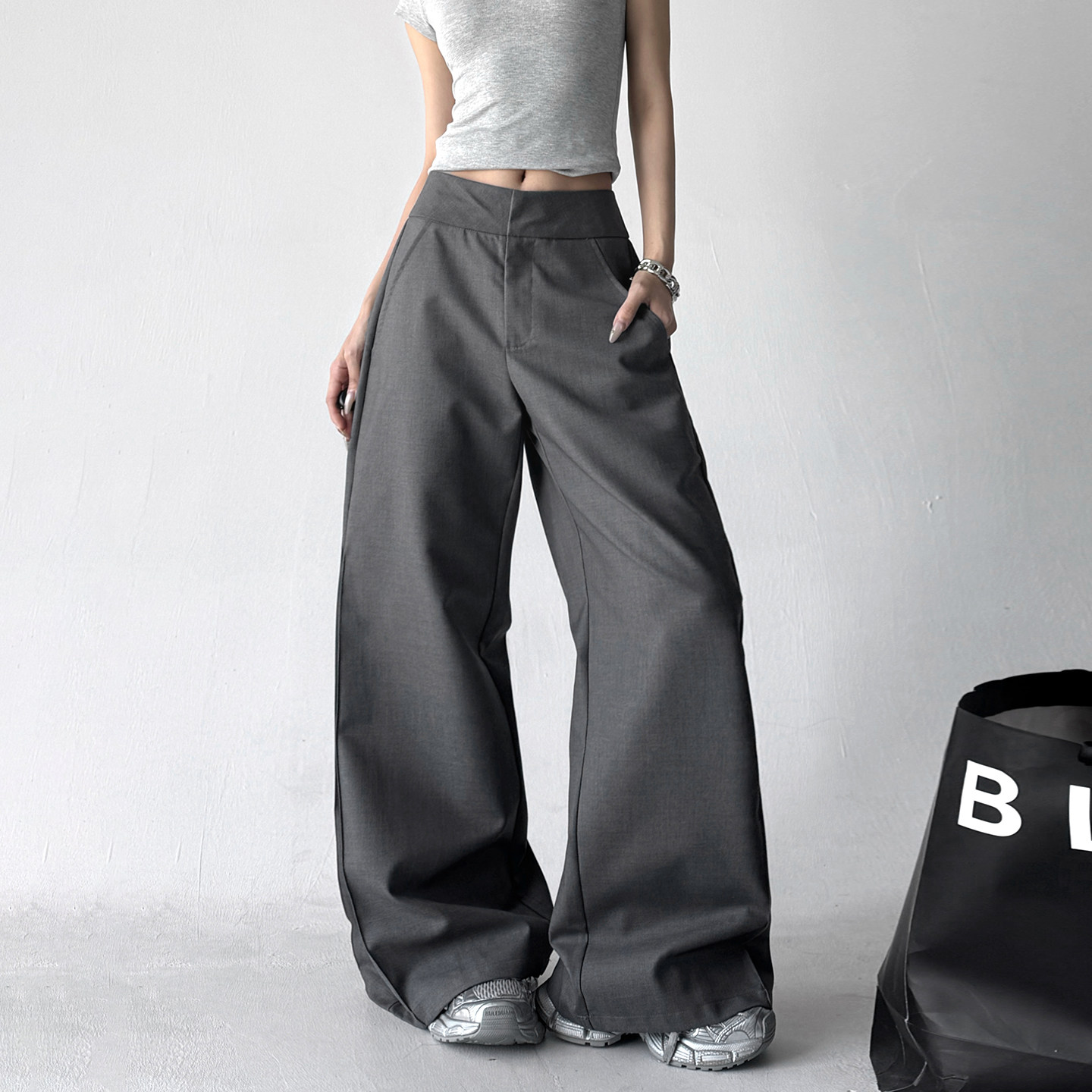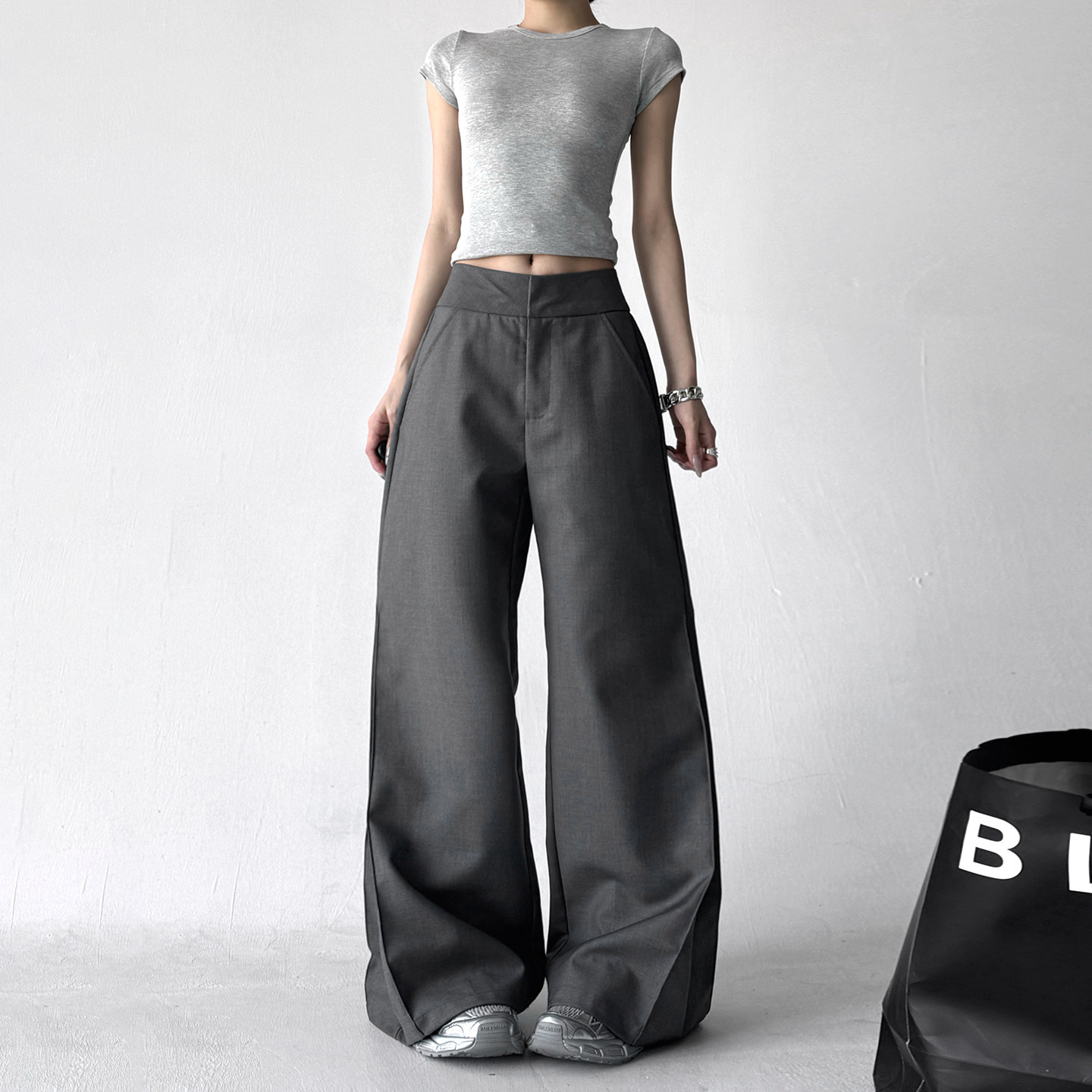 灰色西装高腰显瘦喇叭拖地长裤