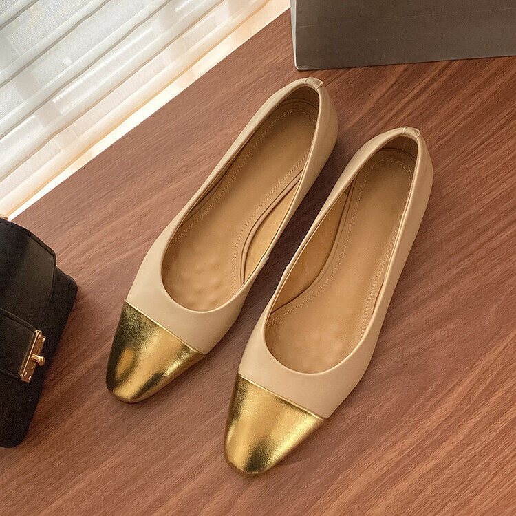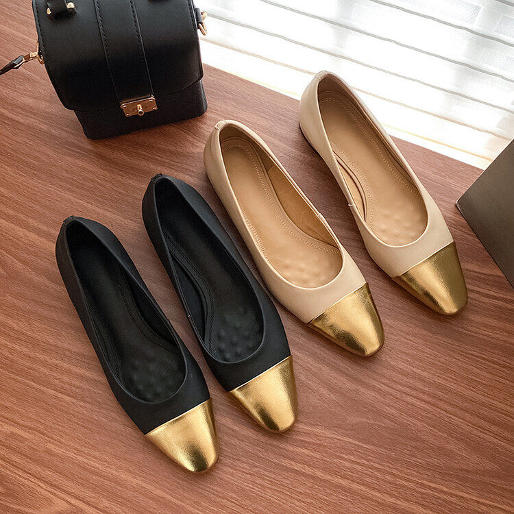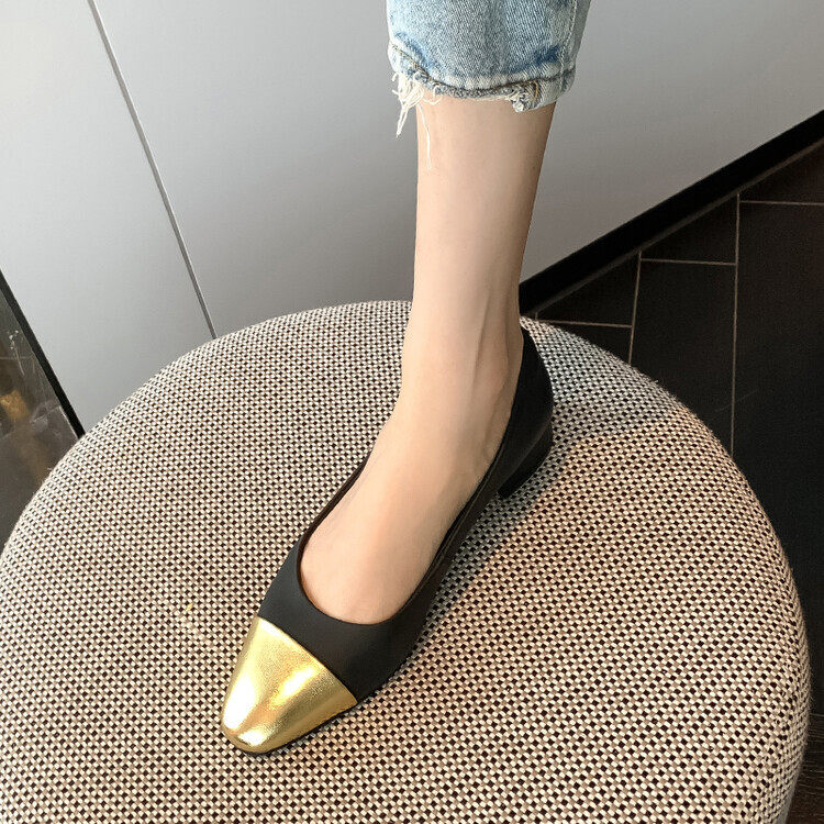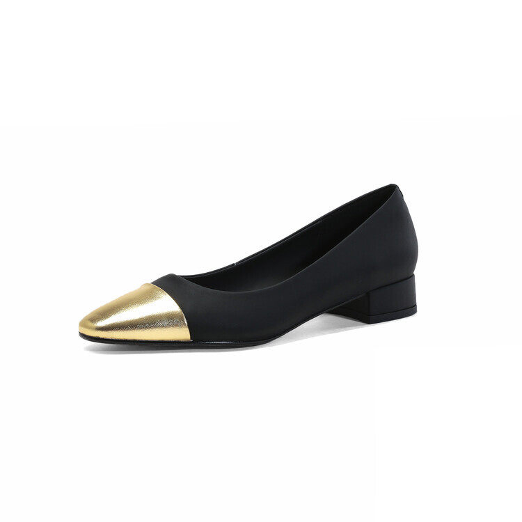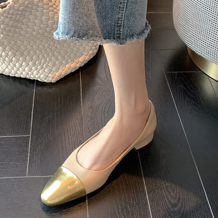 气质款粗跟拼色浅口圆头中跟单鞋2023早春新款时尚舒适休闲单鞋女