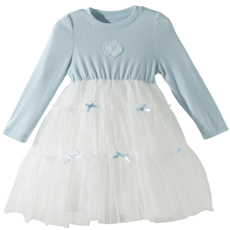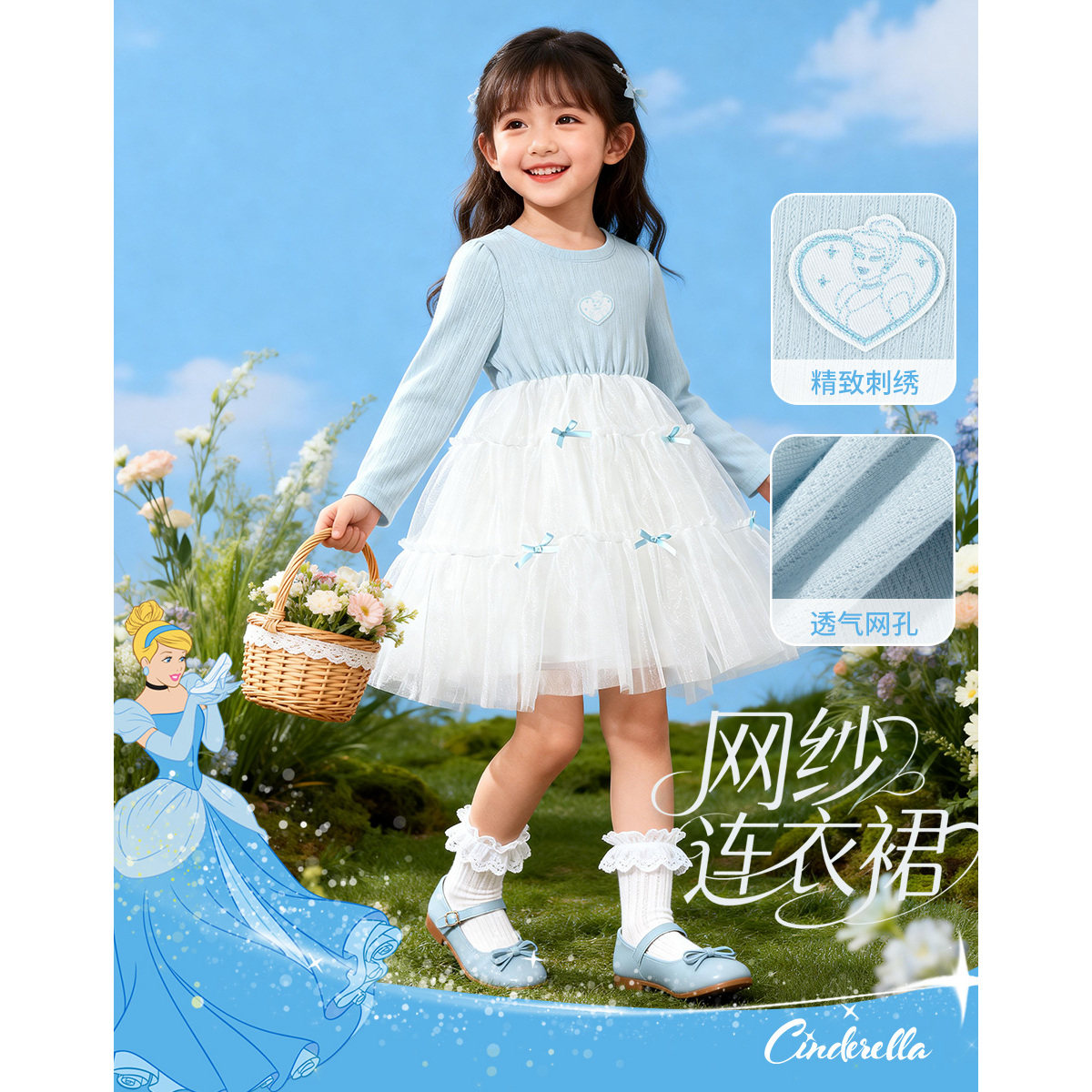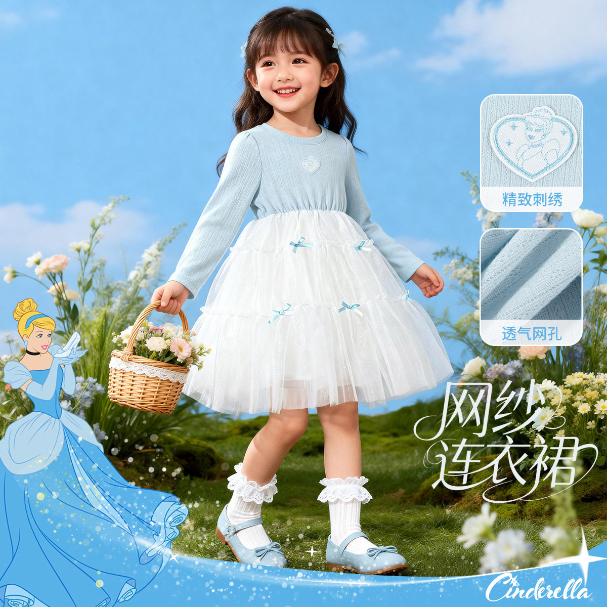 迪士尼中小童装女童长袖连衣裙女孩公主裙春秋季儿童拼接网纱裙子