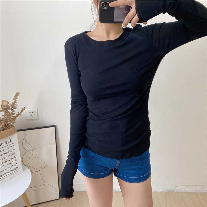 修身薄款微透打底长袖t恤女圆领纸片人ins显瘦防晒衫内搭弹力春夏