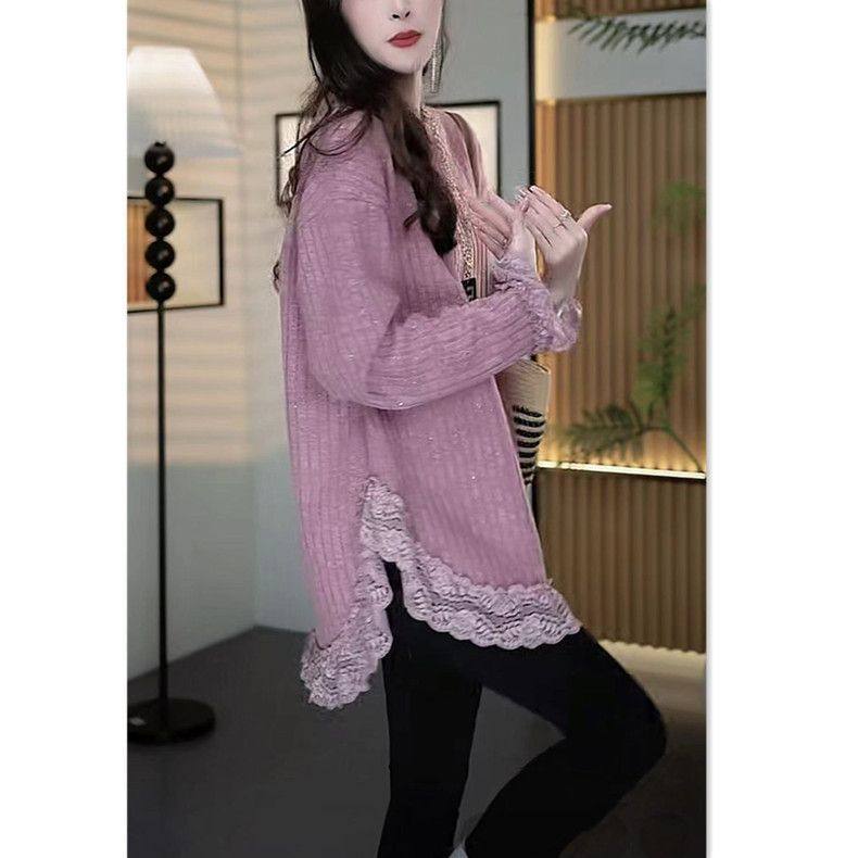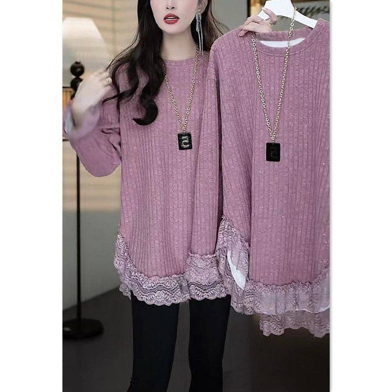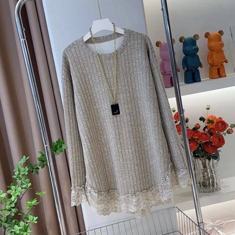 高级蕾丝边加绒加厚中长款圆领T恤女冬宽松显瘦拼接长袖保暖上衣