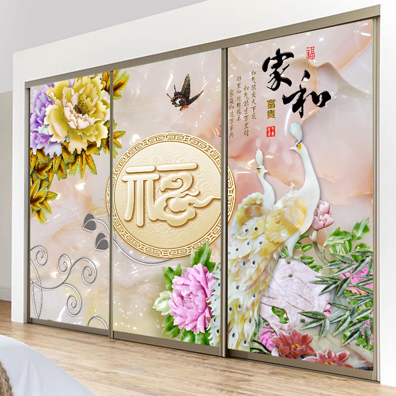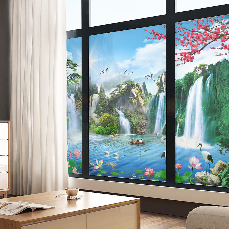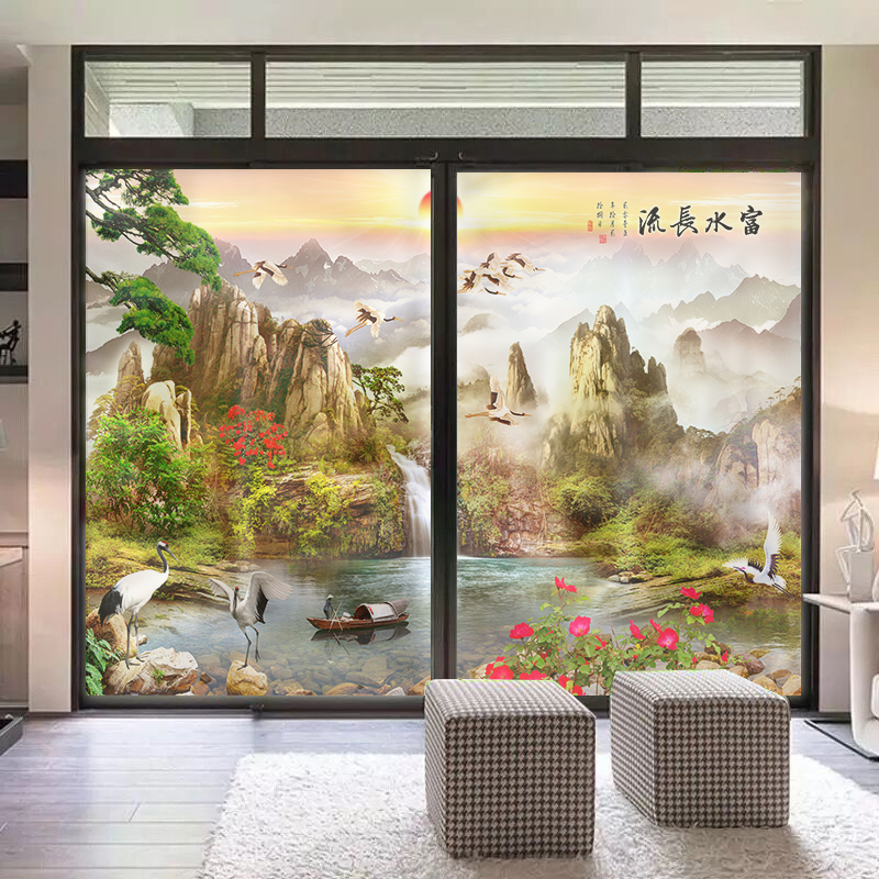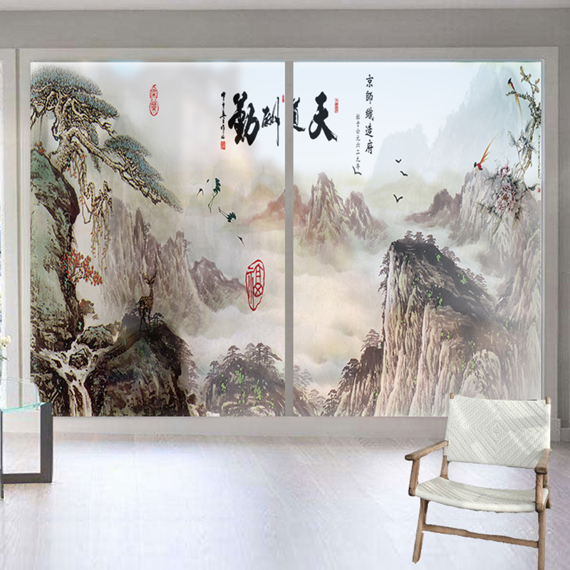 中式山水画窗户磨砂贴膜透光不透明防窥防走光遮光不透人玻璃贴纸