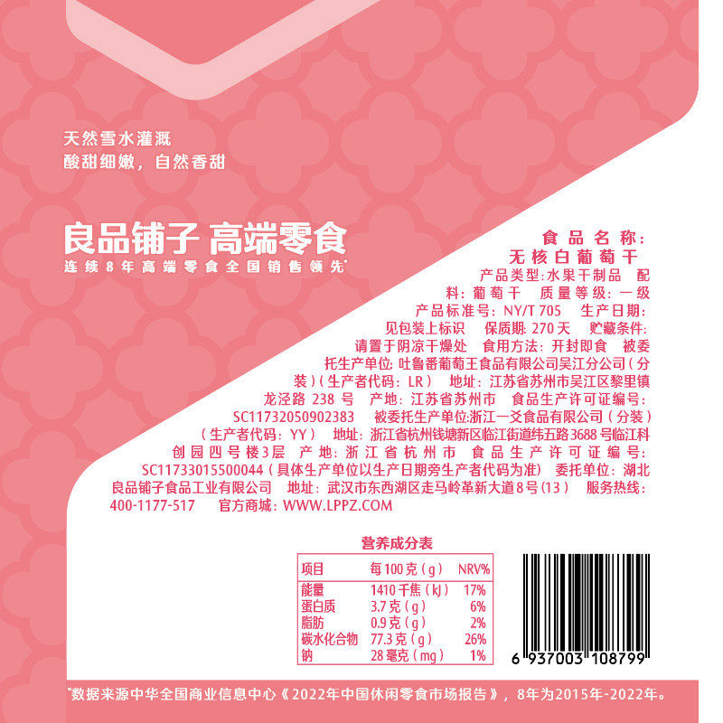 良品铺子无核白葡萄干180gx5袋新疆吐鲁番免洗提子干烘焙休闲零食