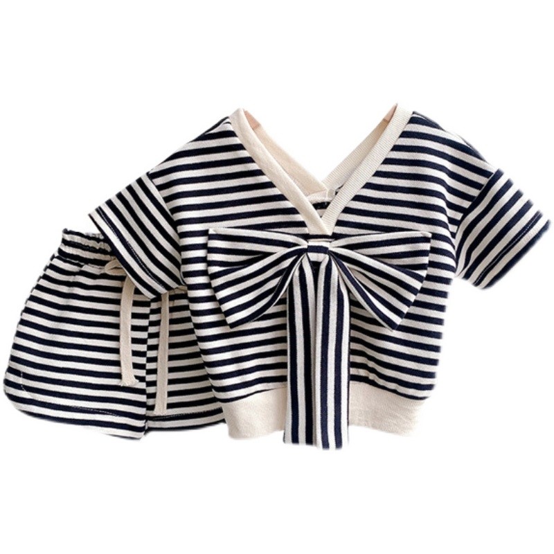 韩国童装夏季新款女童时髦条纹套装儿童蝴蝶结短袖T恤短裤两件套