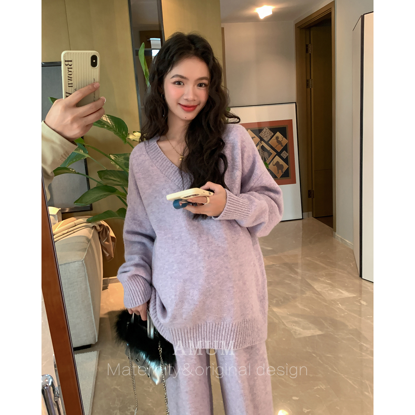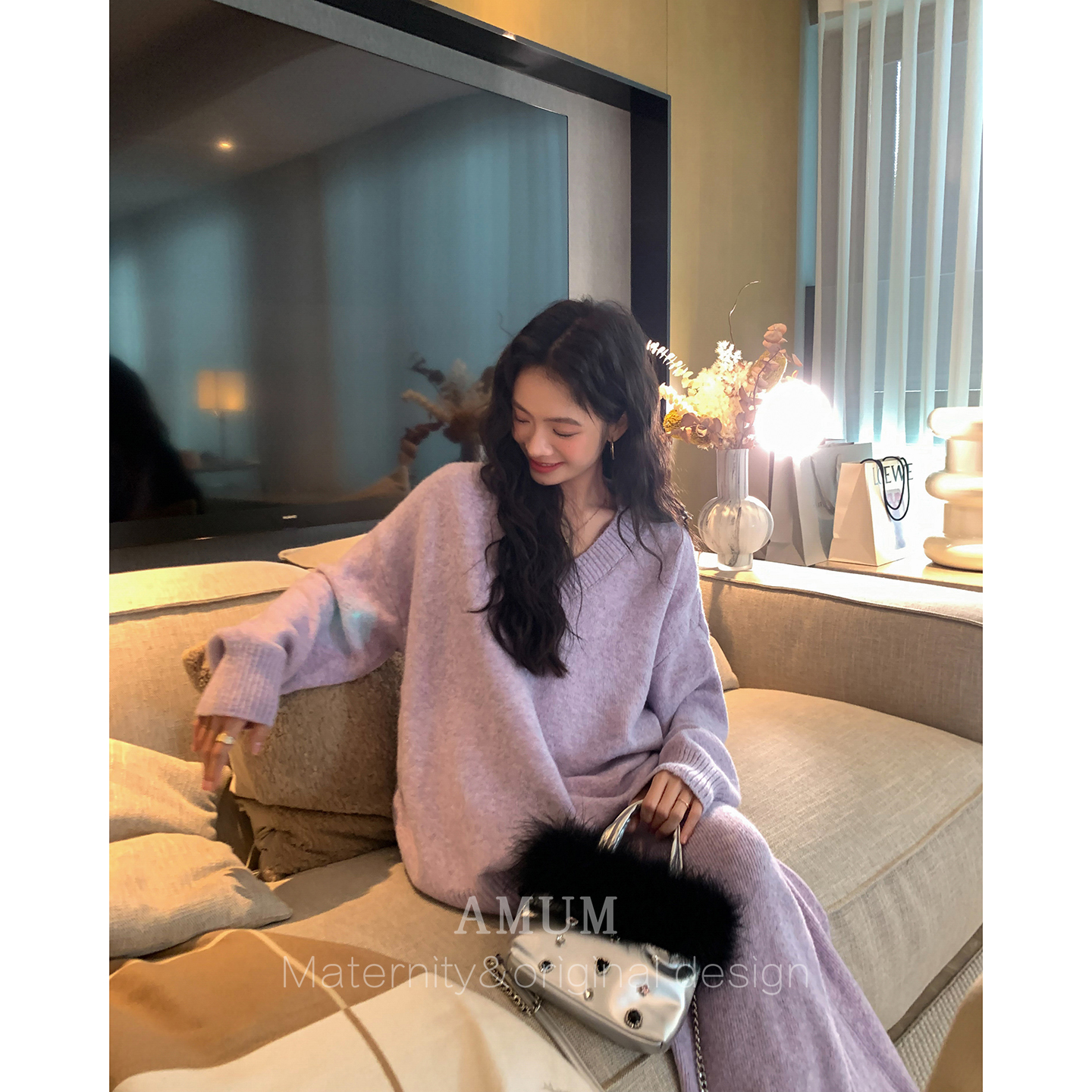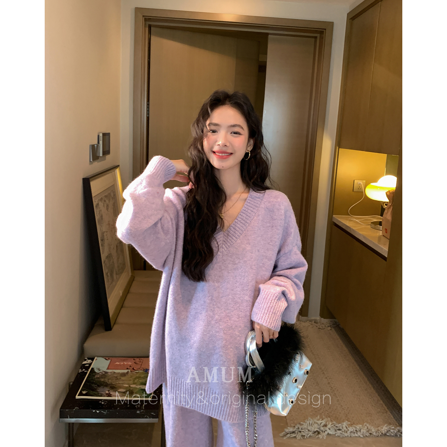 ◆AMUM孕妇装◆慵懒速成~V领套头针织衫宽松休闲阔腿裤保暖两件套
