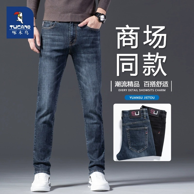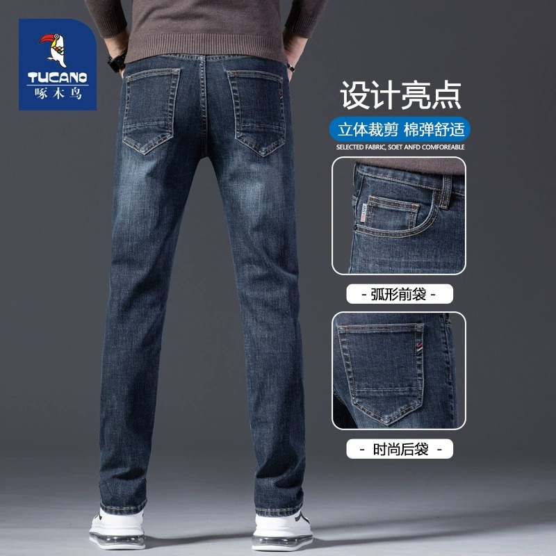 啄木鸟2024新款牛仔裤男弹力修身直筒秋冬厚款休闲冬季加绒长裤男