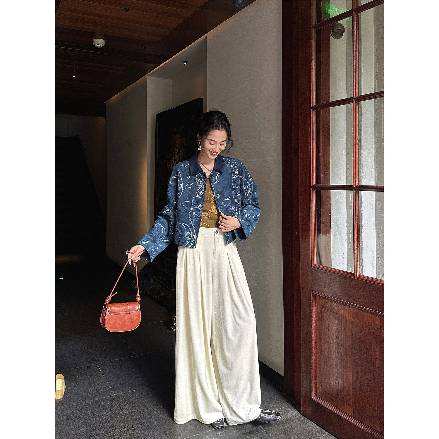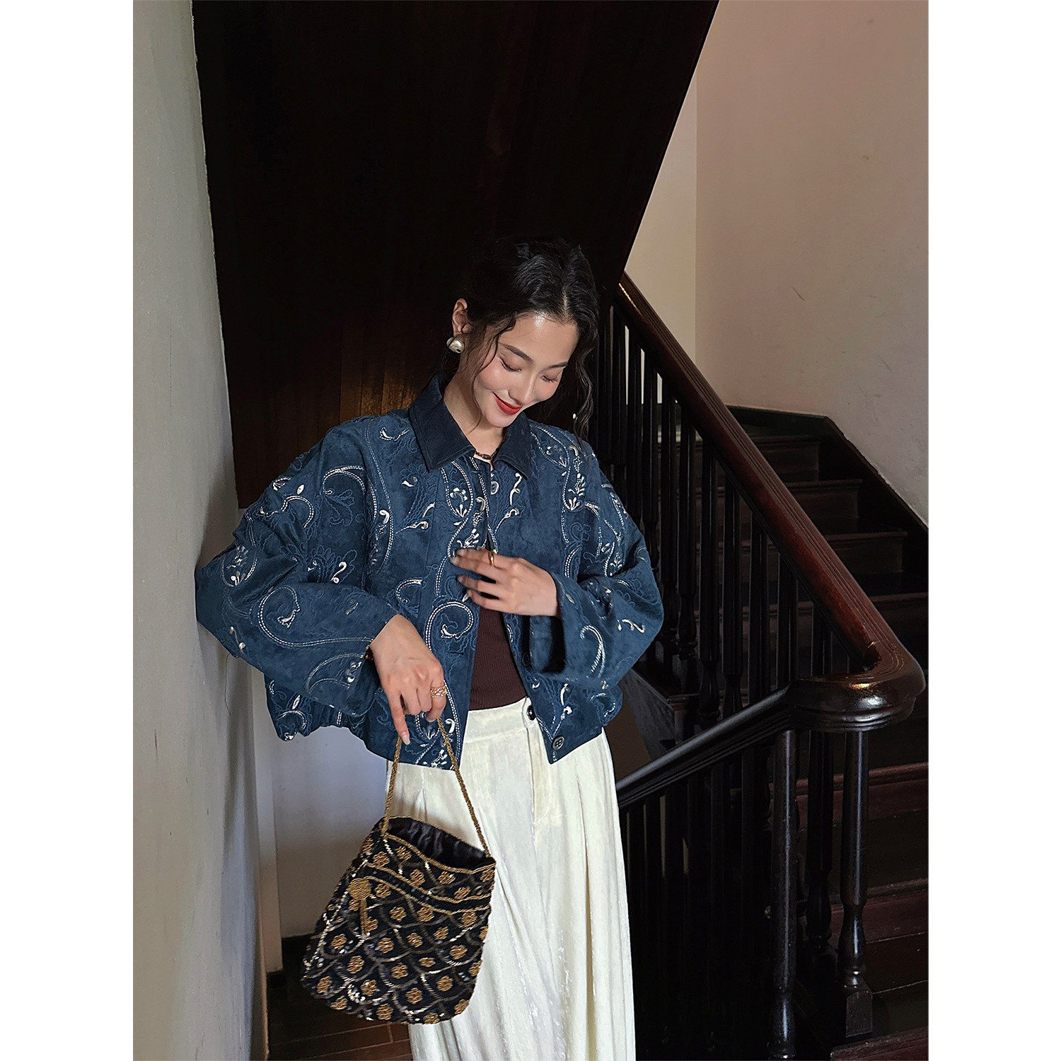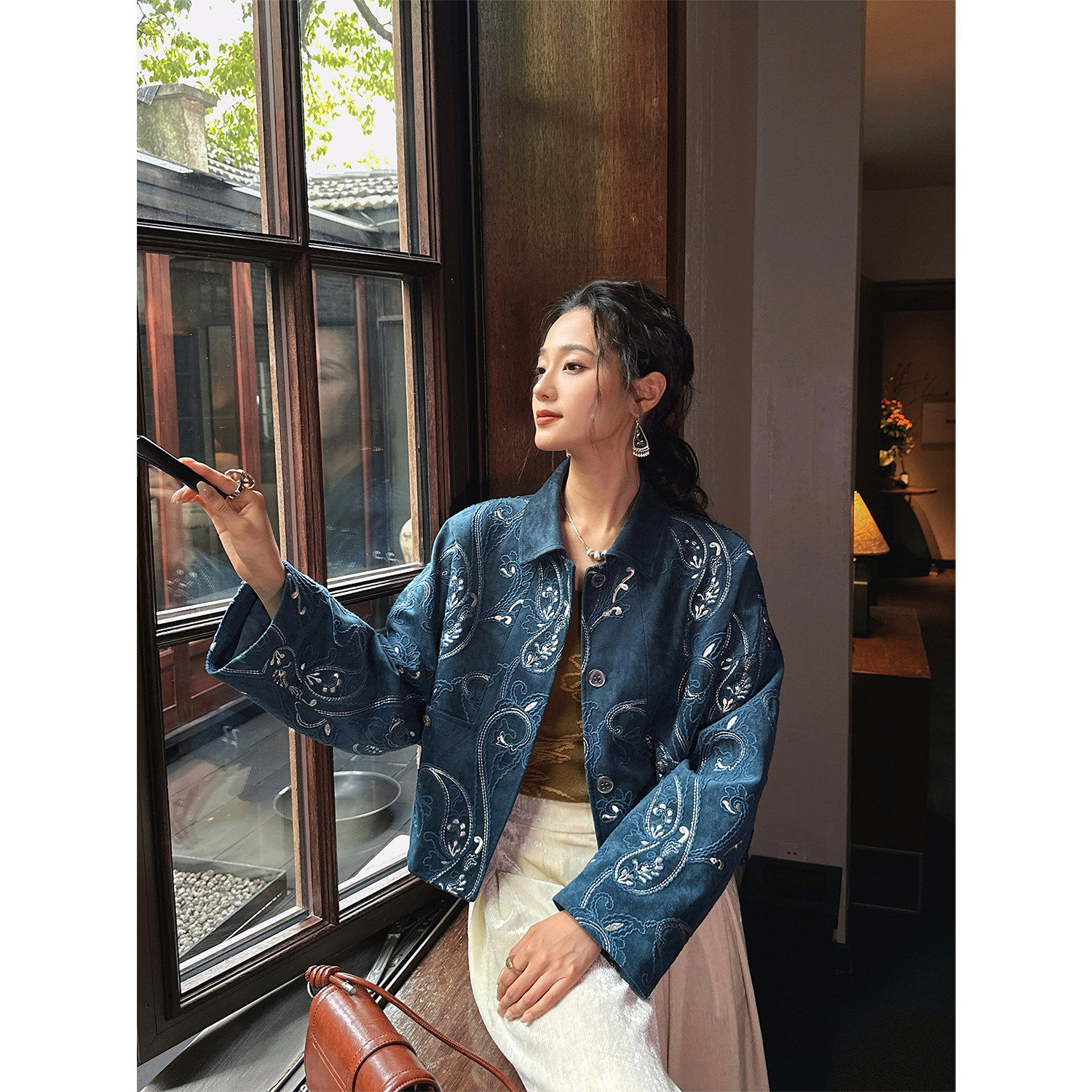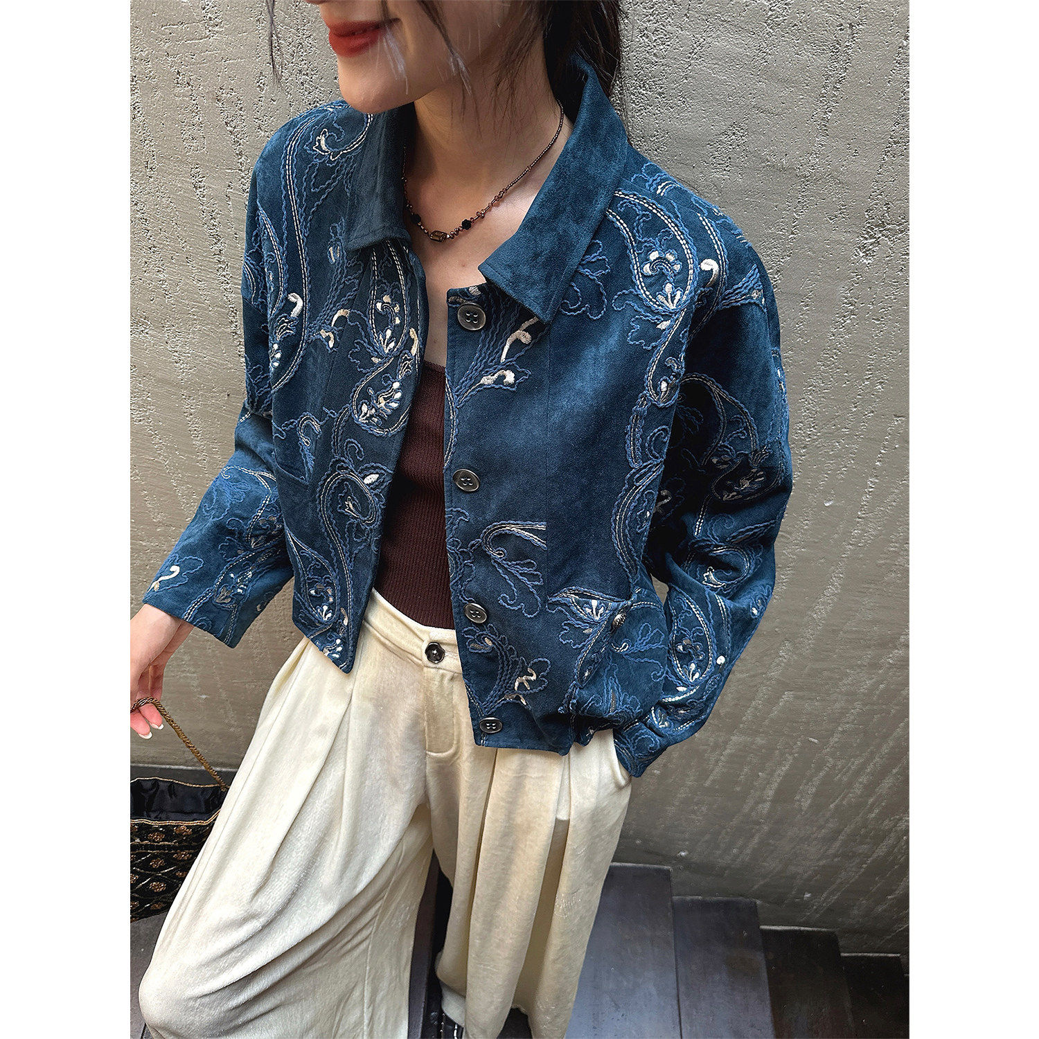 【呼呼专享】三吉黑花【梦徊】秋麂皮腰果花刺绣漂亮短夹克外套