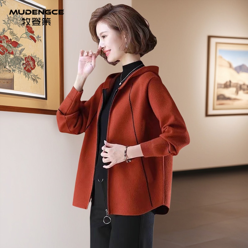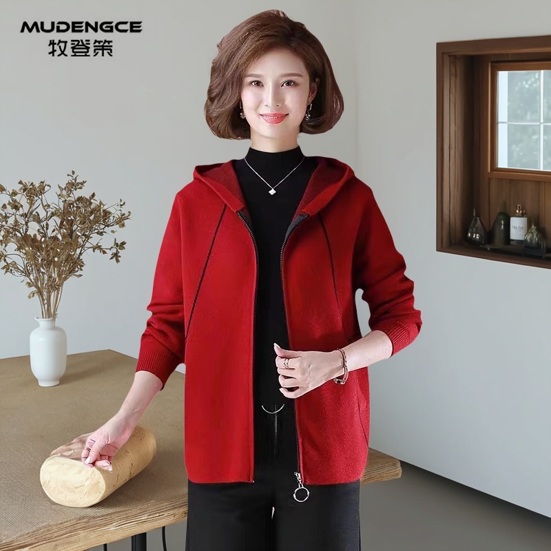 安哥拉红连帽拉链毛衣外套女新款显瘦针织开衫休闲结婚保暖上衣