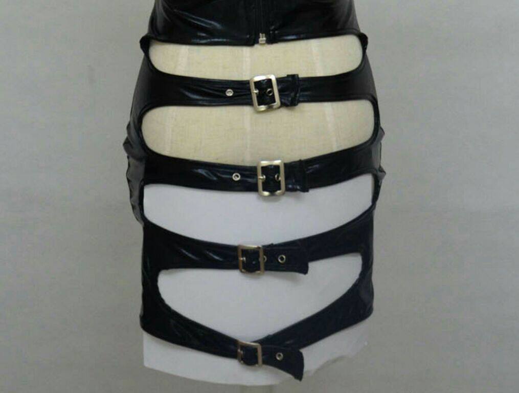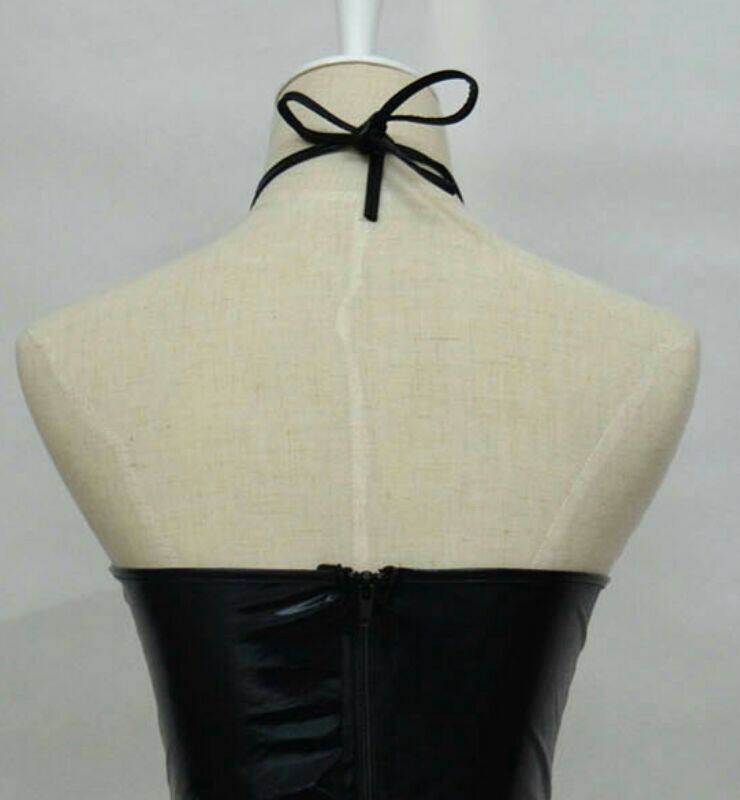 性感黑色漆皮仿皮连衣裙无袖低领挂脖系吊带露臀pp包臀裙夜店女装