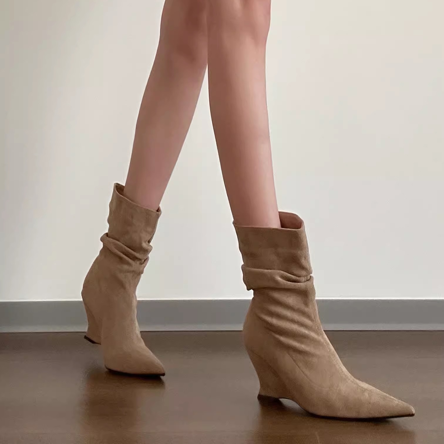 2025秋冬新款尖头坡跟堆堆靴子细跟高跟女士绒面弹力靴瘦瘦短靴