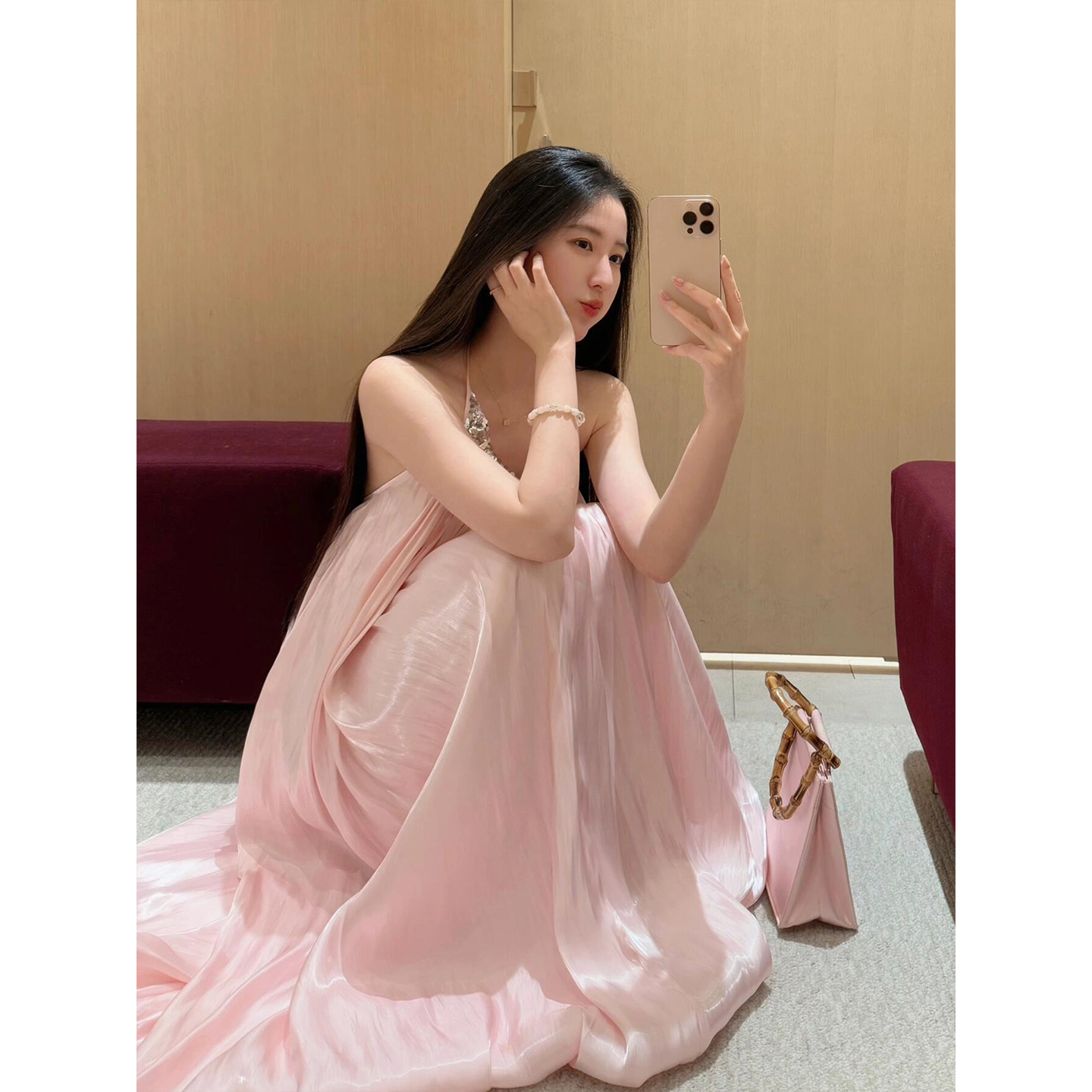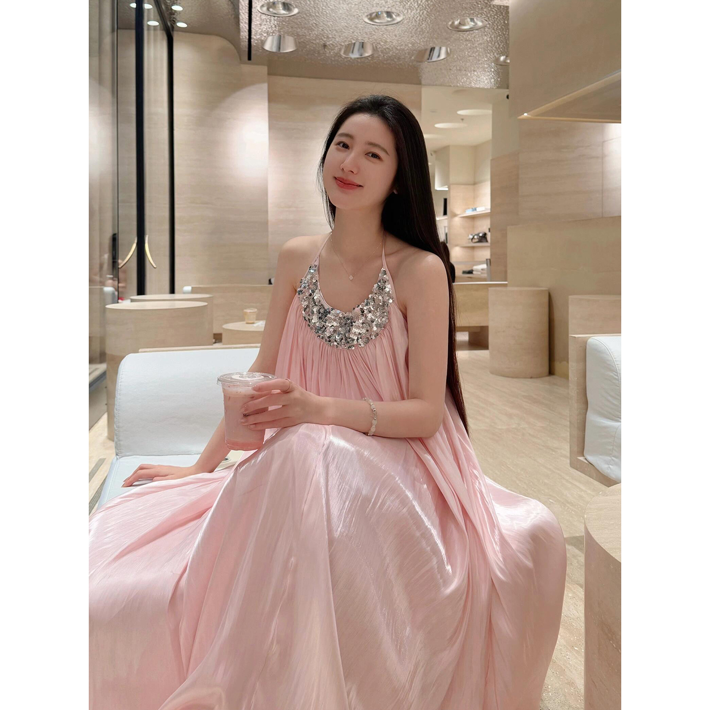 微胖法式名媛粉色亮片挂脖连衣裙