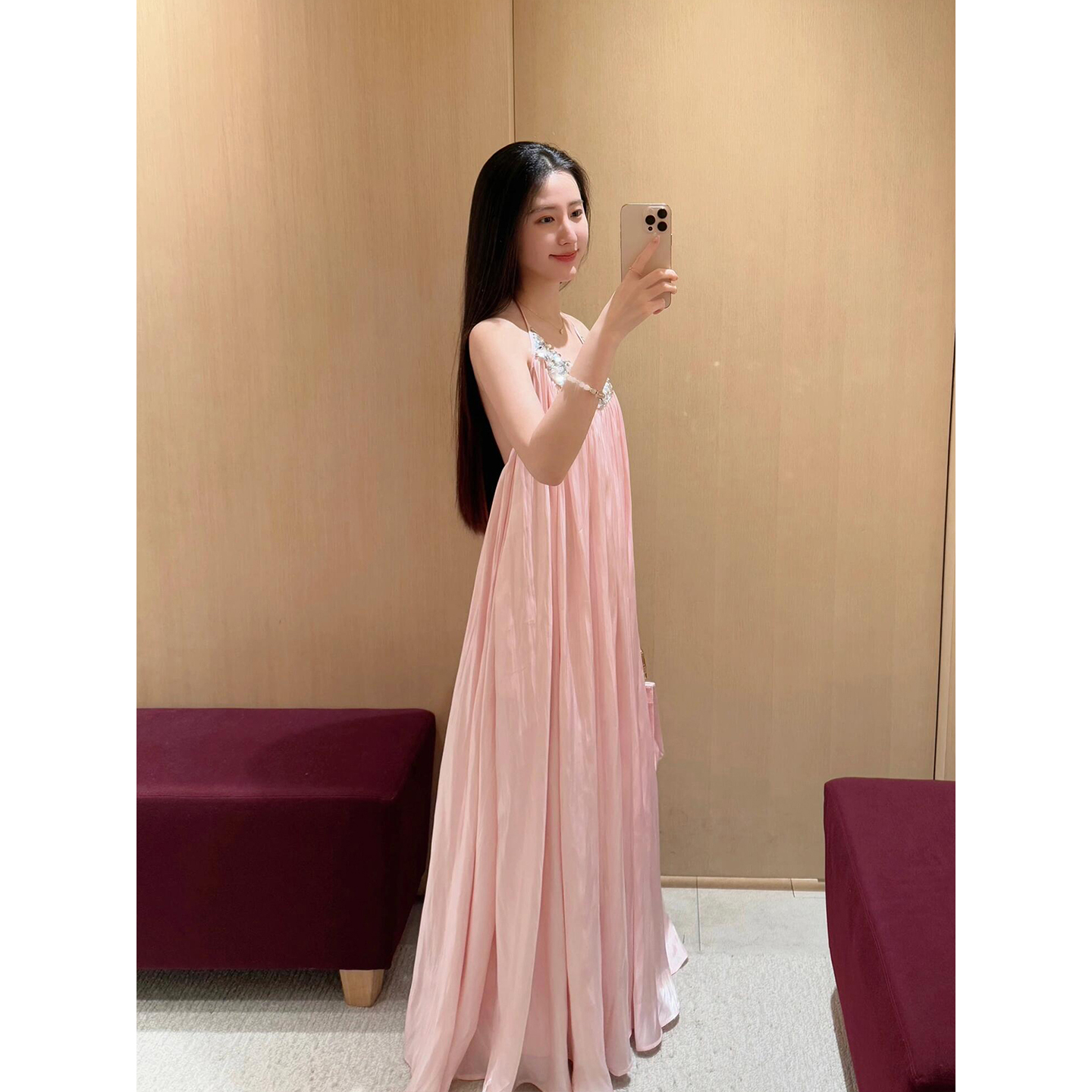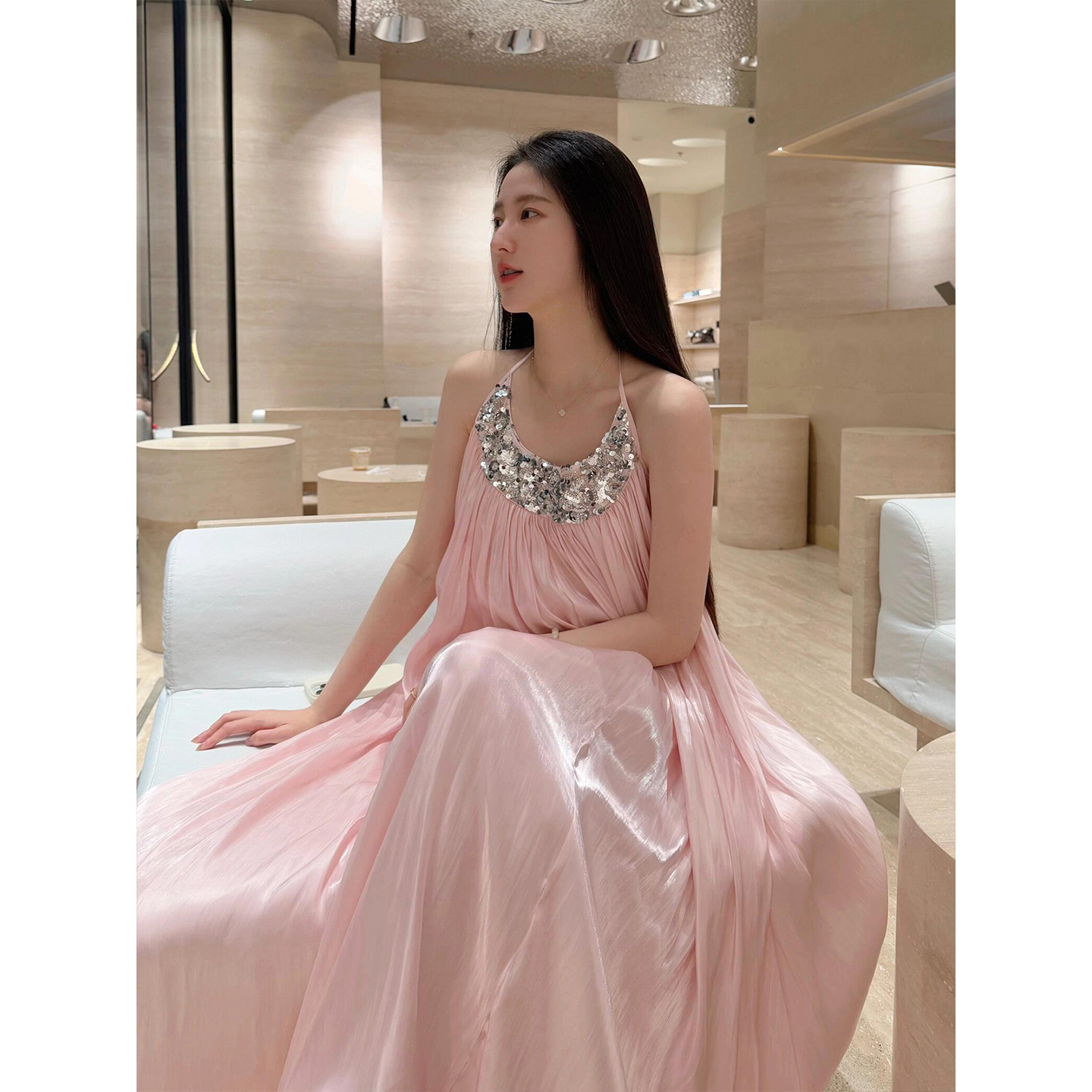 XZY 微胖法式名媛粉色亮片挂脖连衣裙女25年夏季宽松露背仙女长裙