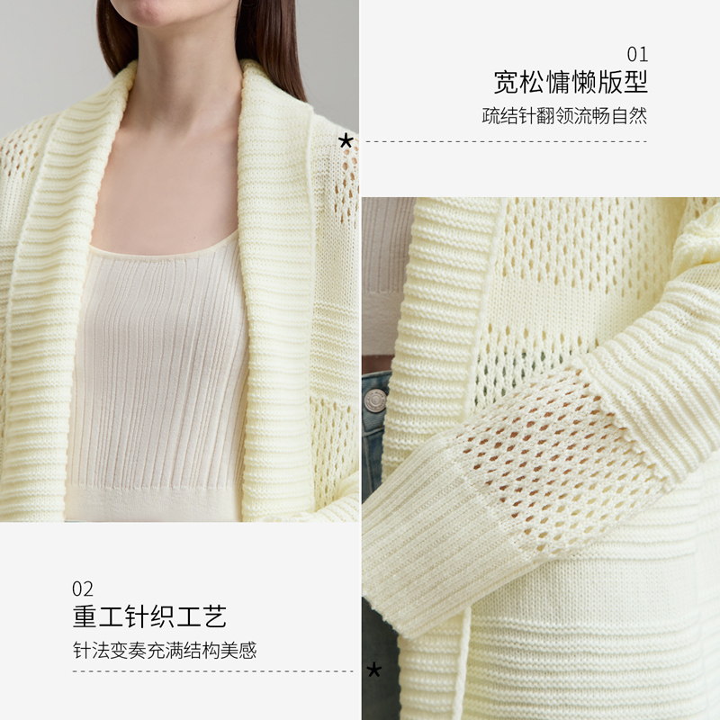 Amii2025秋新款休闲慵懒翻领落肩袖镂空毛织开衫女美拉德色系上衣
