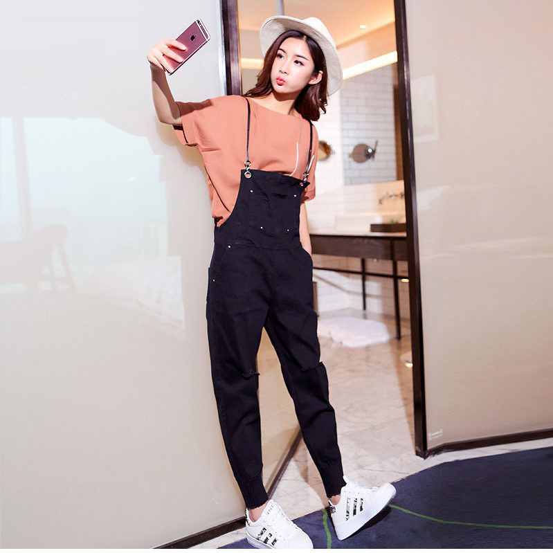 牛仔背带裤女春季学生韩版2017新款九分裤bf风宽松春装破洞连体裤