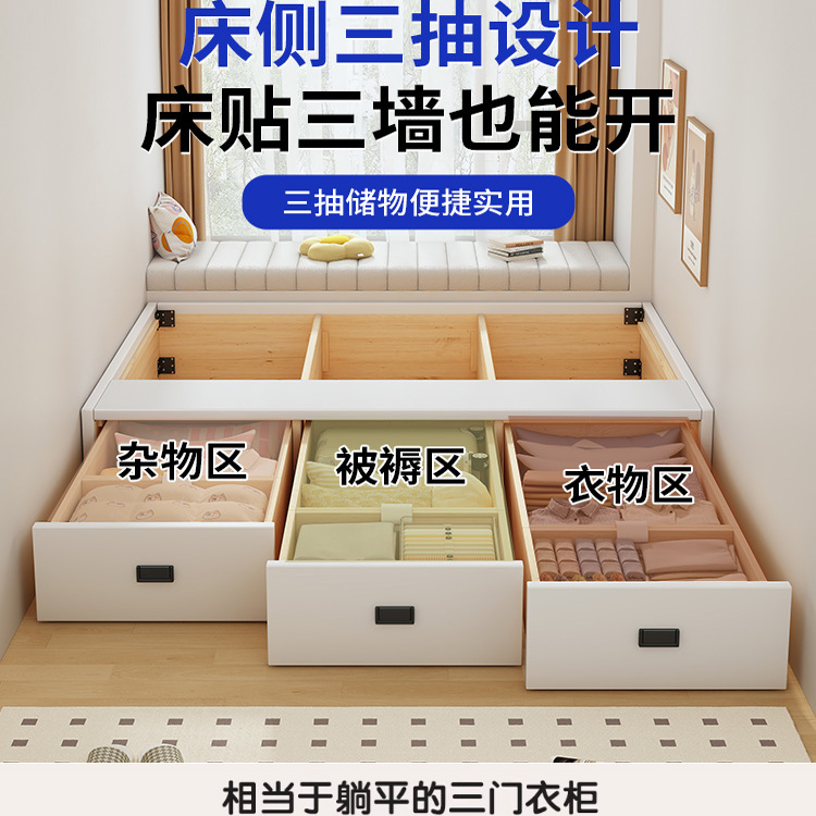 全实木无床头榻榻米小户型双人床卧室三抽尾抽储物落地床支持定制