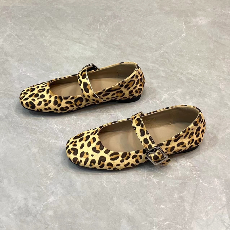 时尚豹纹马毛玛丽珍鞋真皮圆头一字带平底软面舒适潮百搭浅口单鞋