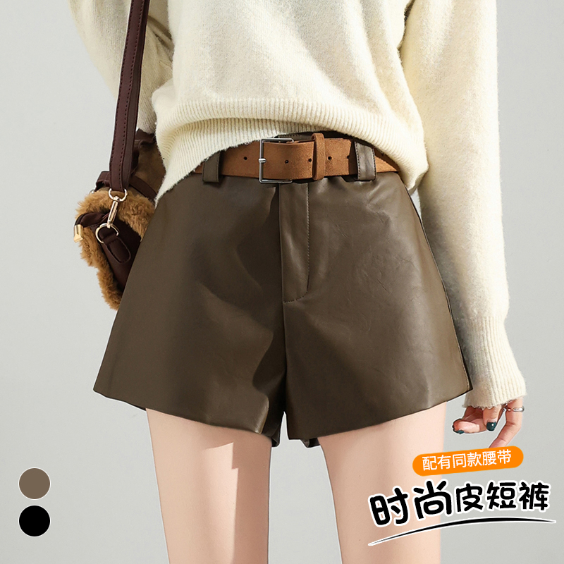 实拍 咖色PU皮短裤女2025秋冬新款小个子高腰显瘦休闲a字阔腿靴裤