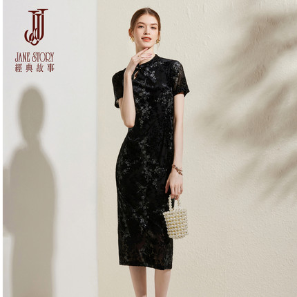新中式国风丝绒烧花连衣裙女2025夏季新款复古立领典雅显瘦旗袍裙