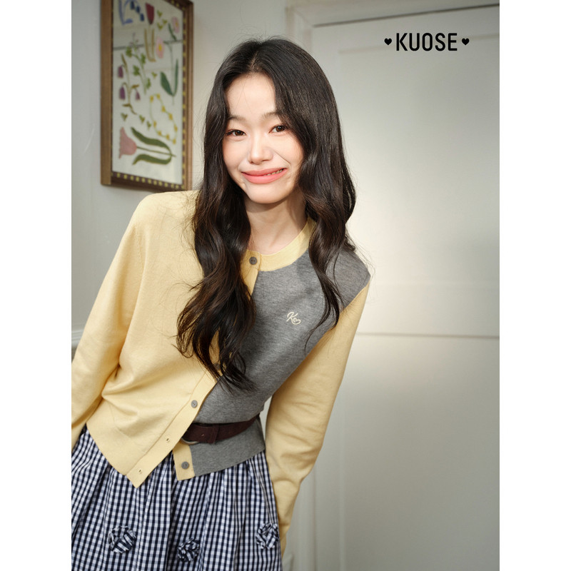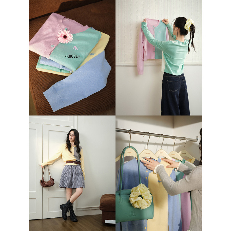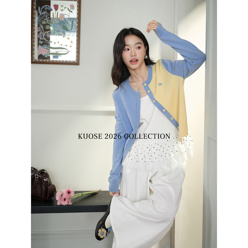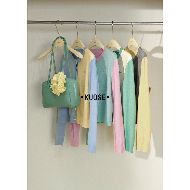 阔色刺绣粉色针织衫长袖上衣女2026早春新款撞色毛衣开衫外套绿色