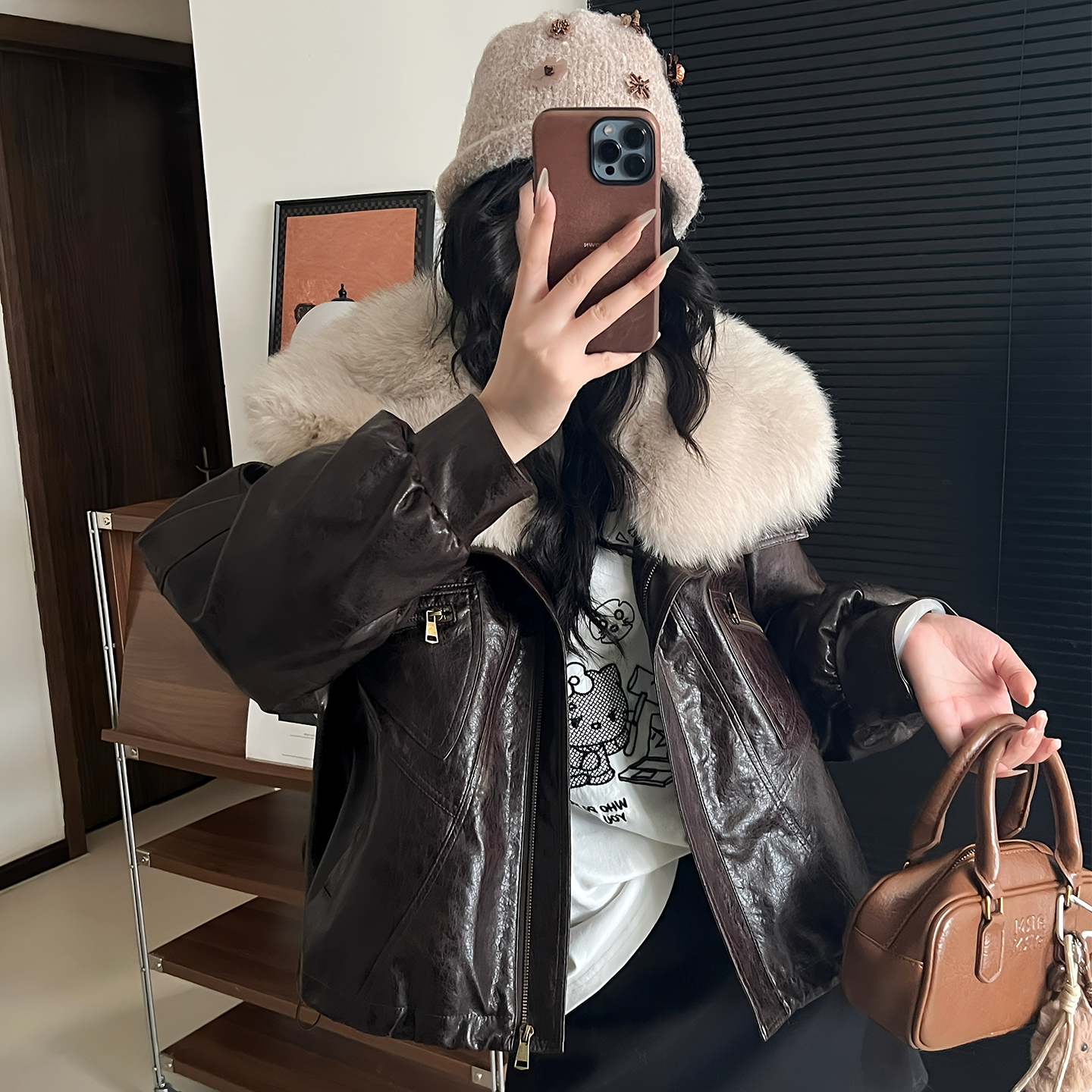 2025海宁新款狐狸毛领皮草外套女冬季鹅绒内胆羽绒服宽松皮衣夹克