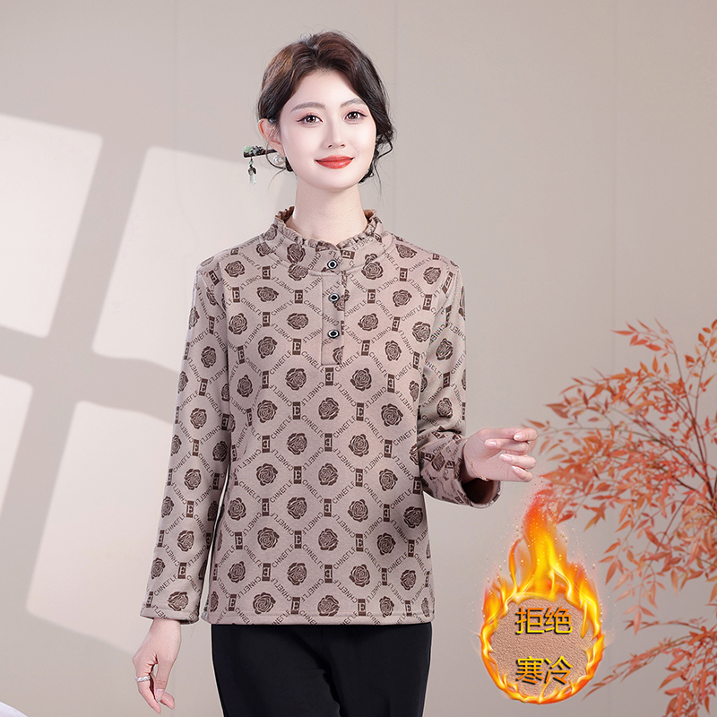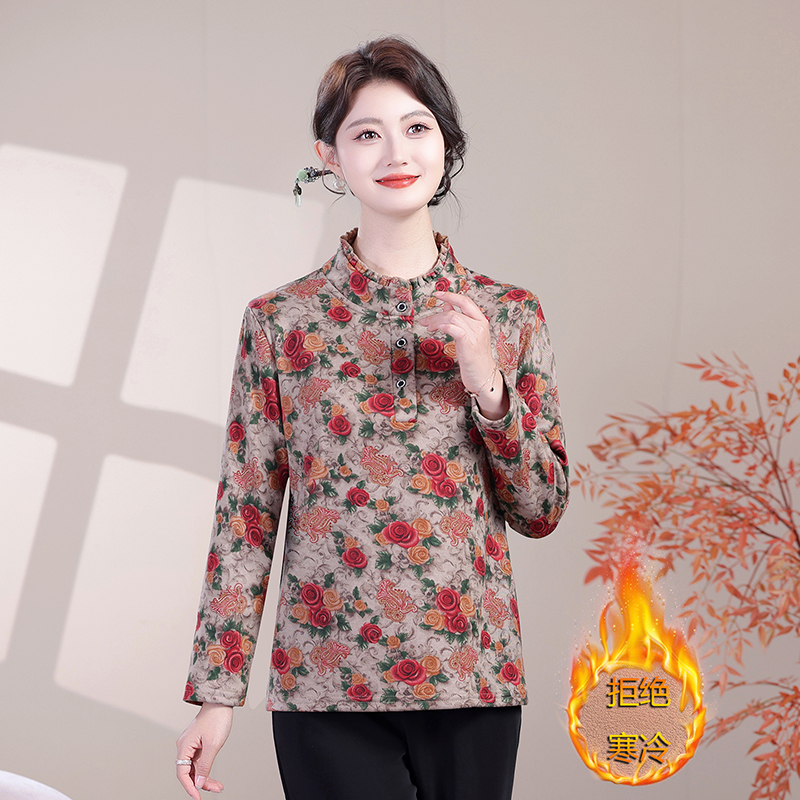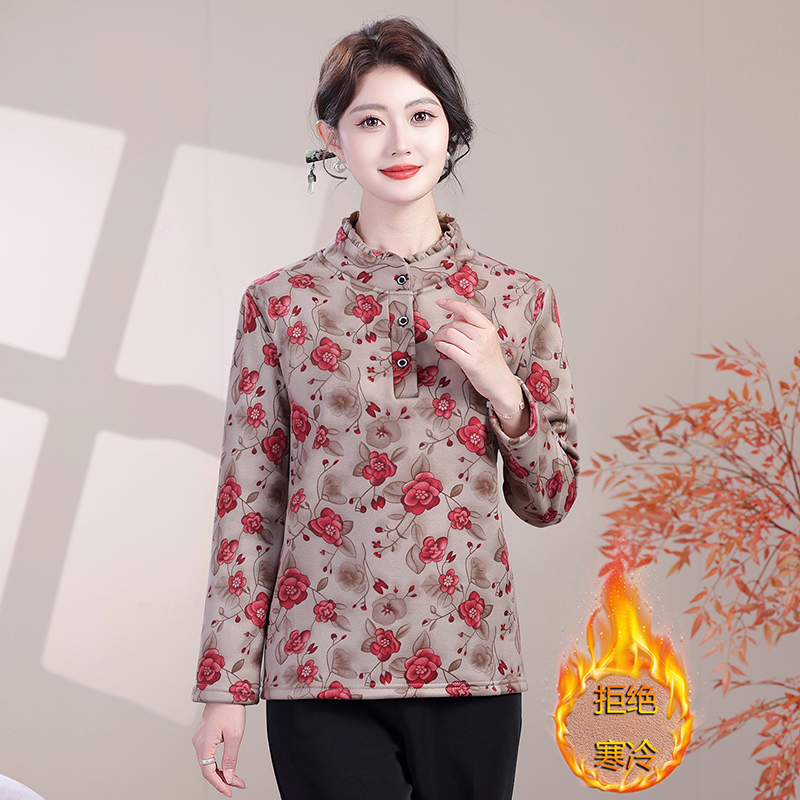 秋冬加绒长袖花衬衫奶奶保暖加厚