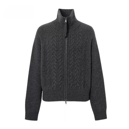 老钱风拉链高领灰色针织开衫