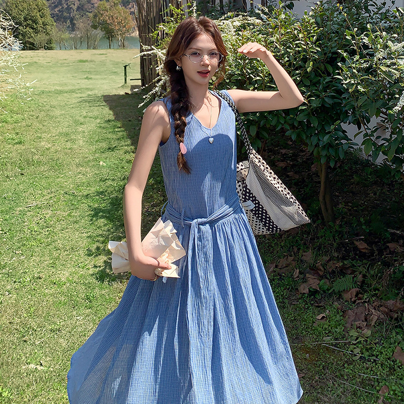 官网女装夏易菲实拍法式复古蓝色V领无袖背心连衣裙2025新款气质