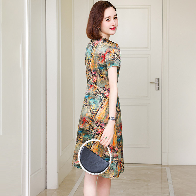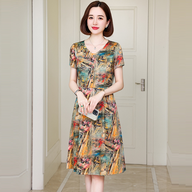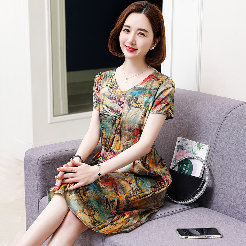 卡若维娅夏装新款妈妈真丝连衣裙女中长款气质印花收腰桑蚕丝裙子