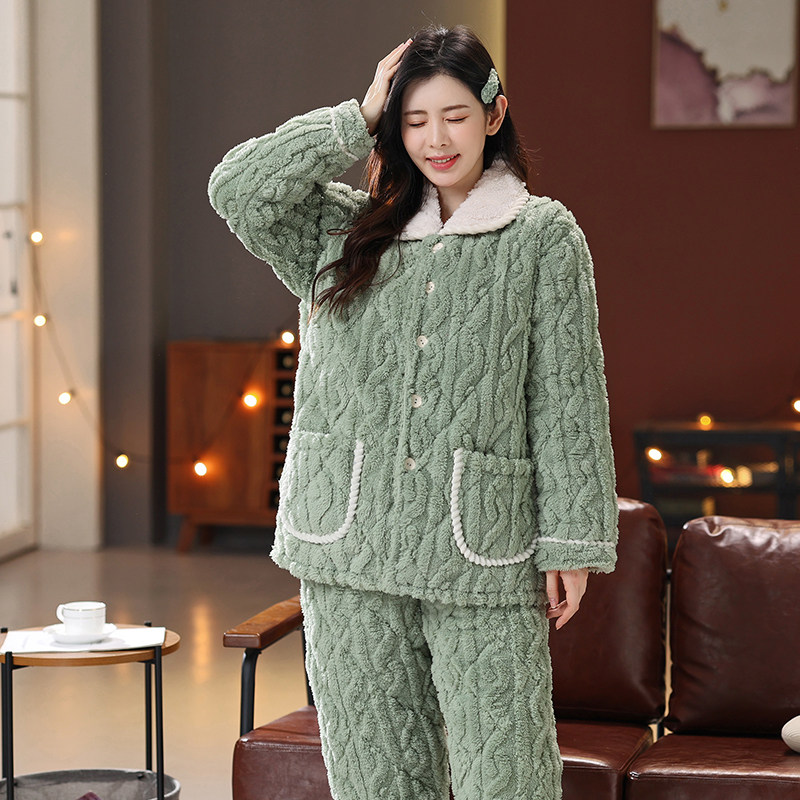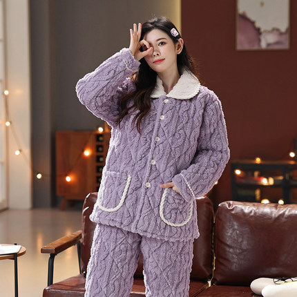 睡衣女冬季珊瑚绒加厚加绒三层夹棉超厚大码可外穿冬天家居服套装
