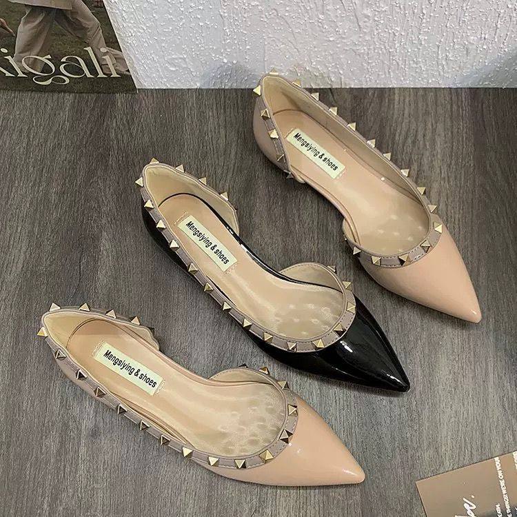 尖头侧空裸色平底单鞋女2025春夏新款浅口铆钉漆皮气质百搭单鞋
