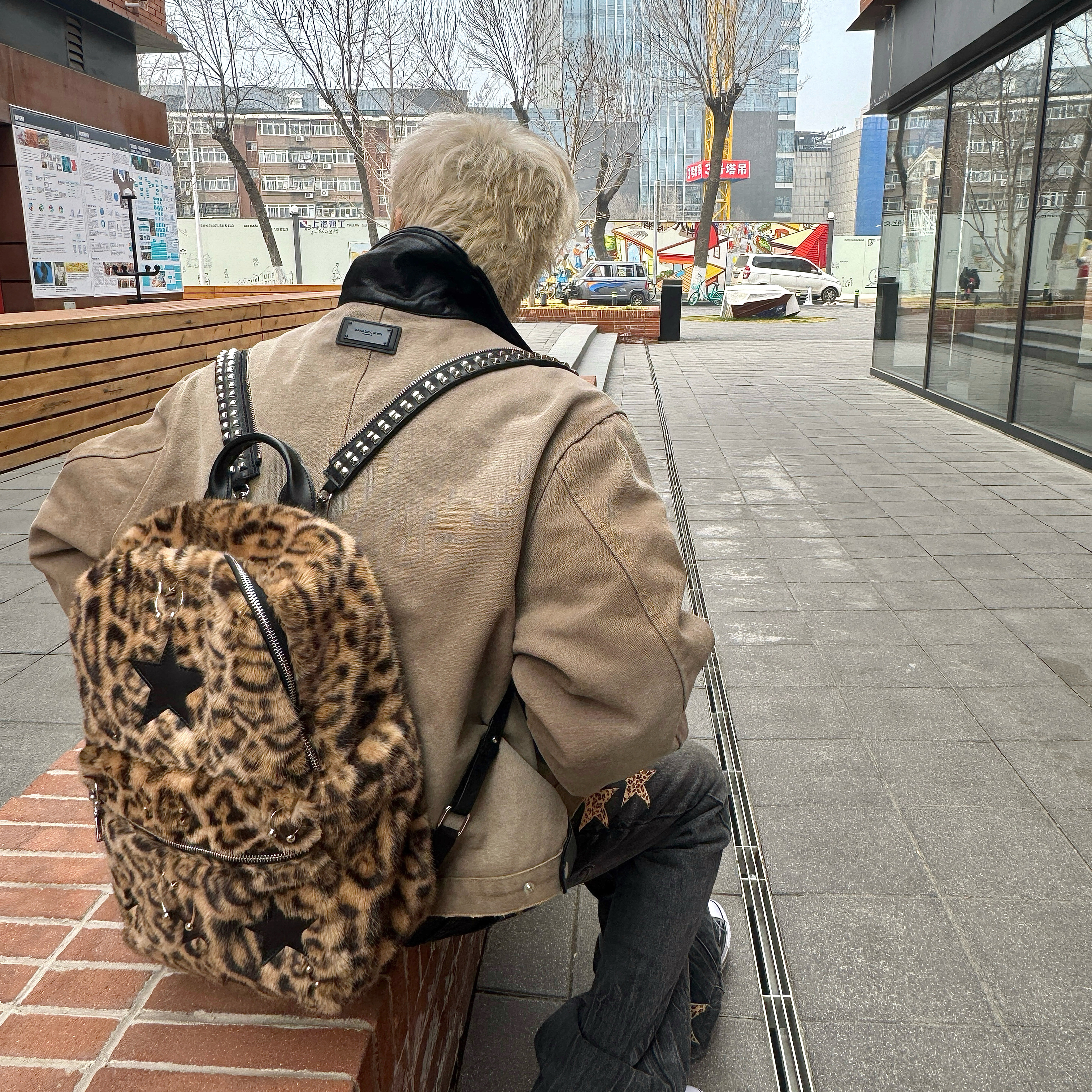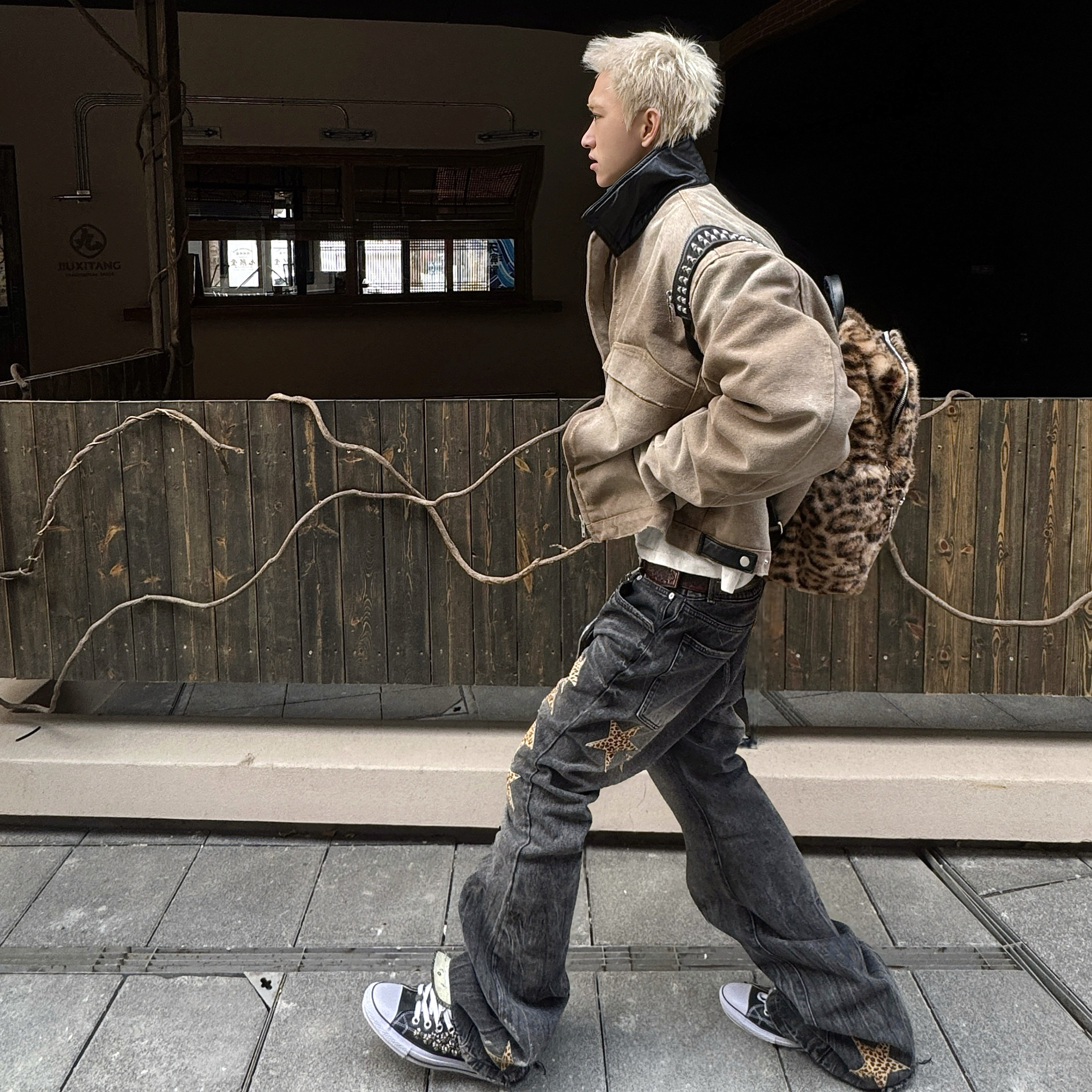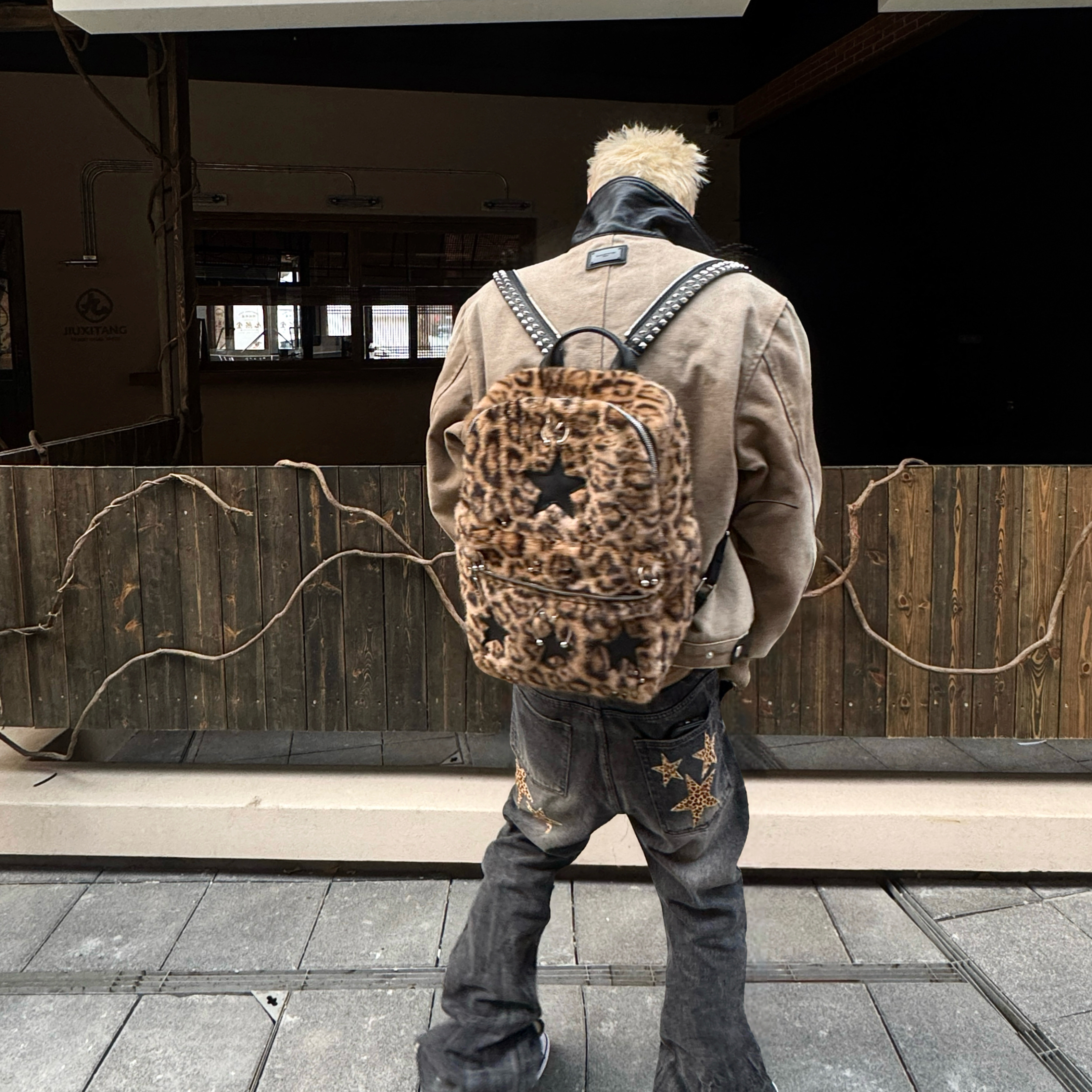 ROLLING MONEY25FW铆钉拉链可调节双色皮质双肩穿孔朋克街头书包