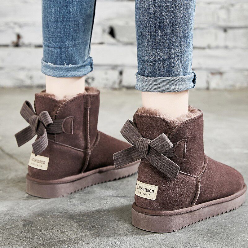 雪地靴女冬季2025真皮加绒加厚雪地棉蝴蝶结厚底大棉鞋保暖靴子