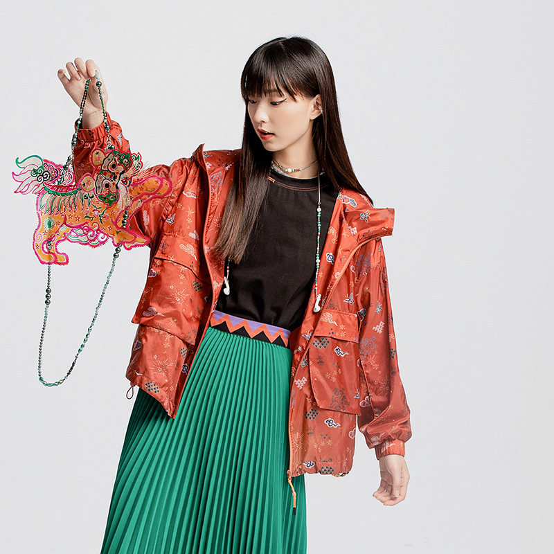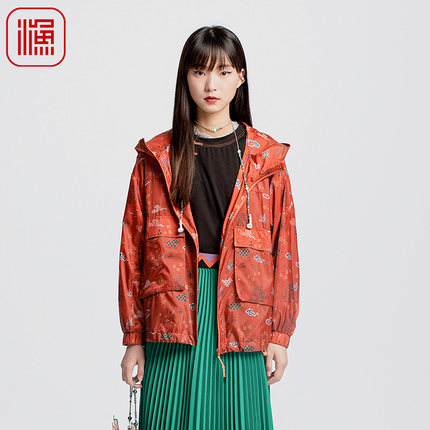 渔牌女装外套女款2024新款连帽印花风衣外套休闲复古上衣FGGC3060